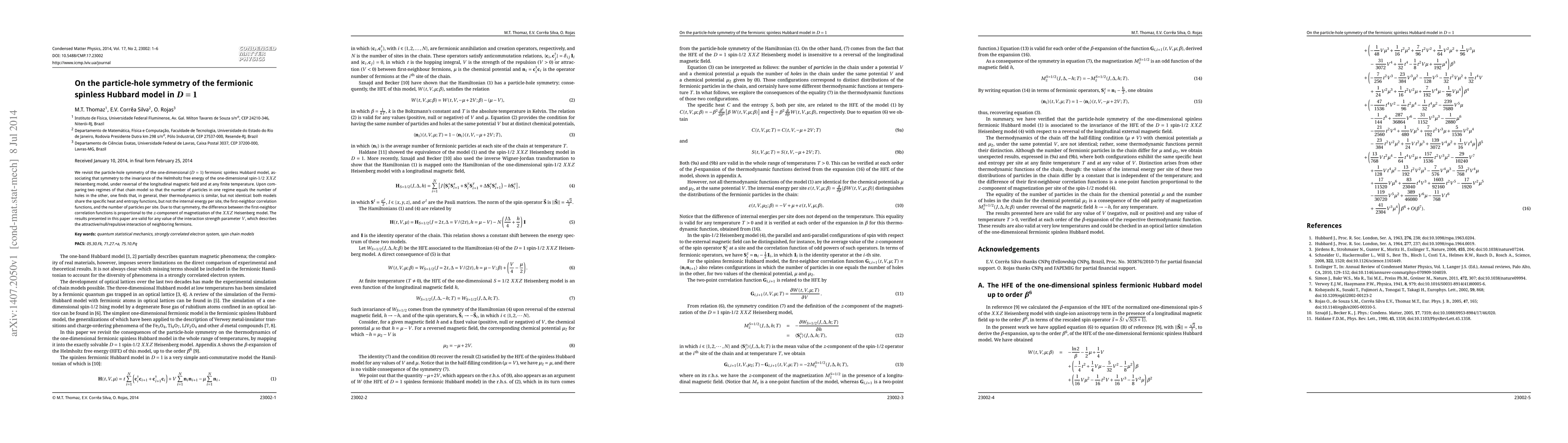 We revisit the particle-hole symmetry of the one-dimensional ($D=1$) fermionic spinless Hubbard model, associating that symmetry to the invariance of the Helmholtz free energy of the one-dimensional spin-1/2 $XXZ$ Heisenberg model, under reversal of the longitudinal magnetic field and at any finite temperature. Upon comparing two regimes of that chain model so that the number of particles in one regime equals the number of holes in the other, one finds that, in general, their thermodynamics is similar, but not identical: both models share the specific heat and entropy functions, but not the internal energy per site, the first-neighbor correlation functions, and the number of particles per site. Due to that symmetry, the difference between the first-neighbor correlation functions is proportional to the $z$-component of magnetization of the $XXZ$ Heisenberg model. The results presented in this paper are valid for any value of the interaction strength parameter $V$, which describes the attractive/null/repulsive interaction of neighboring fermions.