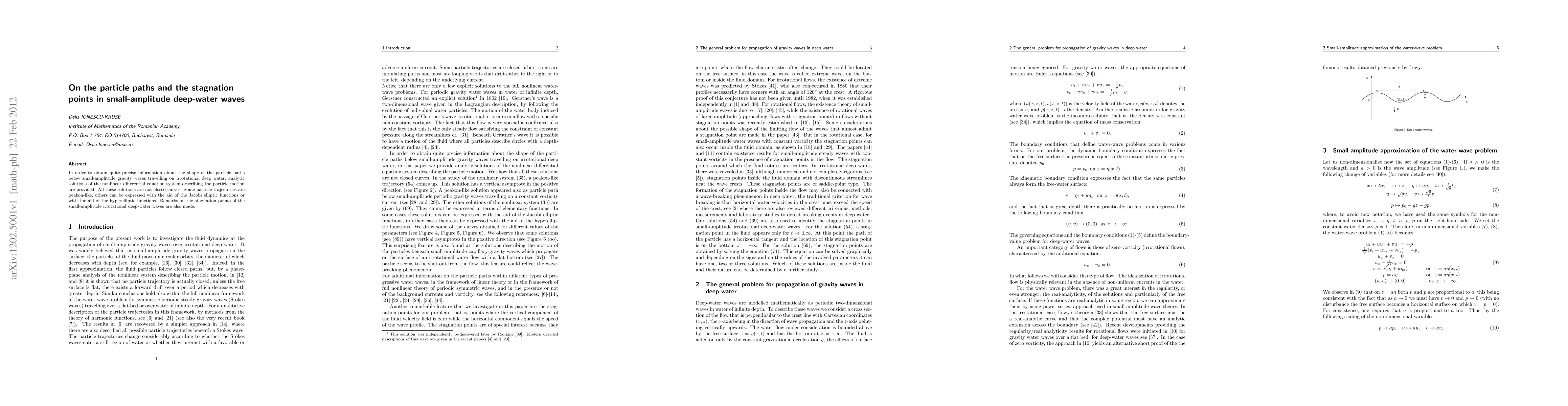 This paper provides analytic solutions for the particle paths beneath small-amplitude deep-water waves, revealing that none form closed curves, with some trajectories resembling peakons or expressed via Jacobi and hyperelliptic functions. It also discusses stagnation points in the context of these waves.
