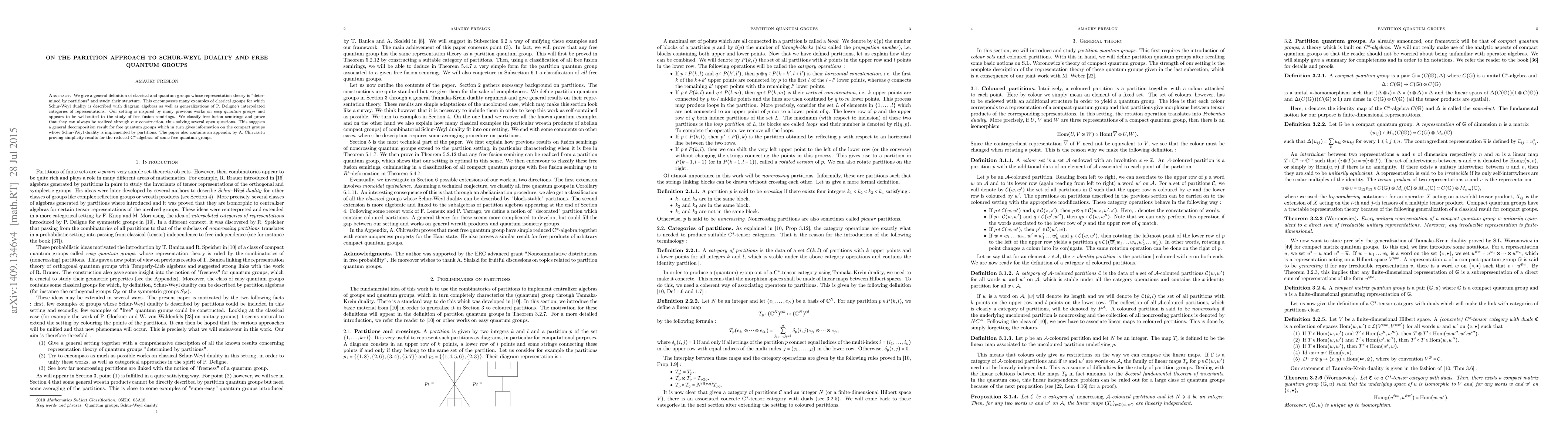 We give a general definition of classical and quantum groups whose representation theory is "determined by partitions" and study their structure. This encompasses many examples of classical groups for which Schur-Weyl duality is described with diagram algebras as well as generalizations of P. Deligne's interpolated categories of representations. Our setting is inspired by many previous works on easy quantum groups and appears to be well-suited to the study of free fusion semirings. We classify free fusion semirings and prove that they can always be realized through our construction, thus solving several open questions. This suggests a general decomposition result for free quantum groups which in turn gives information on the compact groups whose Schur-Weyl duality is implemented by partitions. The paper also contains an appendix by A. Chirvasitu proving simplicity results for the reduced C*-algebras of some free quantum groups.