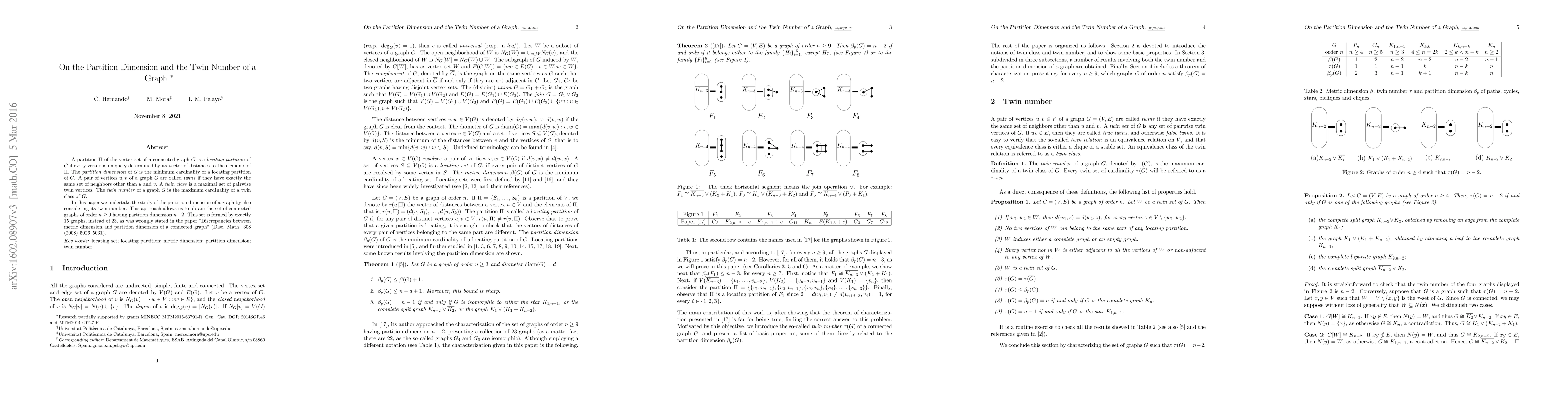 A partition P of the vertex set of a connected graph G is a locating partition of G if every vertex is uniquely determined by its vector of distances to the elements of P. The partition dimension of G is the minimum cardinality of a locating partition of G. A pair of vertices u,v of a graph G are called twins if they have exactly the same set of neighbors other than u and v. A twin class is a maximal set of pairwise twin vertices. The twin number of a graph G is the maximum cardinality of a twin class of G. In this paper we undertake the study of the partition dimension of a graph by also considering its twin number. This approach allows us to obtain the set of connected graphs of order n having partition dimension n-2. This set is formed by exactly 15 graphs, instead of 23, as was wrongly stated in the paper: "Discrepancies between metric dimension and partition dimension of a connected graph", published in Discrete Mathematics in 2008.