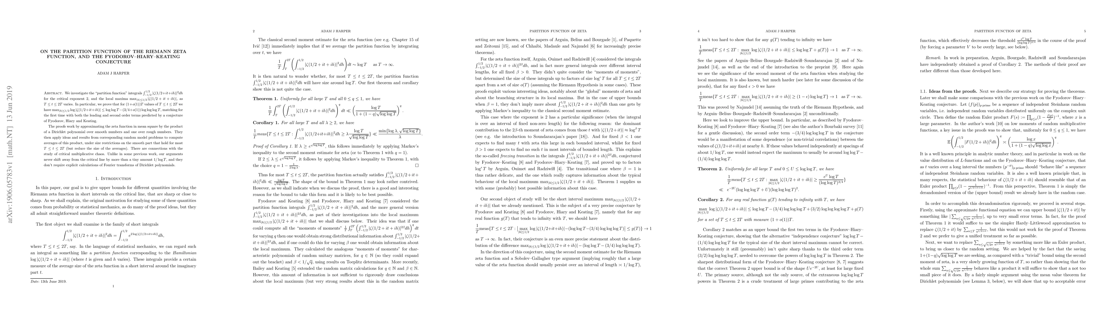 We investigate the ``partition function'' integrals $\int_{-1/2}^{1/2} |\zeta(1/2 + it + ih)|^2 dh$ for the critical exponent 2, and the local maxima $\max_{|h| \leq 1/2} |\zeta(1/2 + it + ih)|$, as $T \leq t \leq 2T$ varies. In particular, we prove that for $(1+o(1))T$ values of $T \leq t \leq 2T$ we have $\max_{|h| \leq 1/2} \log|\zeta(1/2+it+ih)| \leq \log\log T - (3/4 + o(1))\log\log\log T$, matching for the first time with both the leading and second order terms predicted by a conjecture of Fyodorov, Hiary and Keating. The proofs work by approximating the zeta function in mean square by the product of a Dirichlet polynomial over smooth numbers and one over rough numbers. They then apply ideas and results from corresponding random model problems to compute averages of this product, under size restrictions on the smooth part that hold for most $T \leq t \leq 2T$ (but reduce the size of the averages). There are connections with the study of critical multiplicative chaos. Unlike in some previous work, our arguments never shift away from the critical line by more than a tiny amount $1/\log T$, and they don't require explicit calculations of Fourier transforms of Dirichlet polynomials.