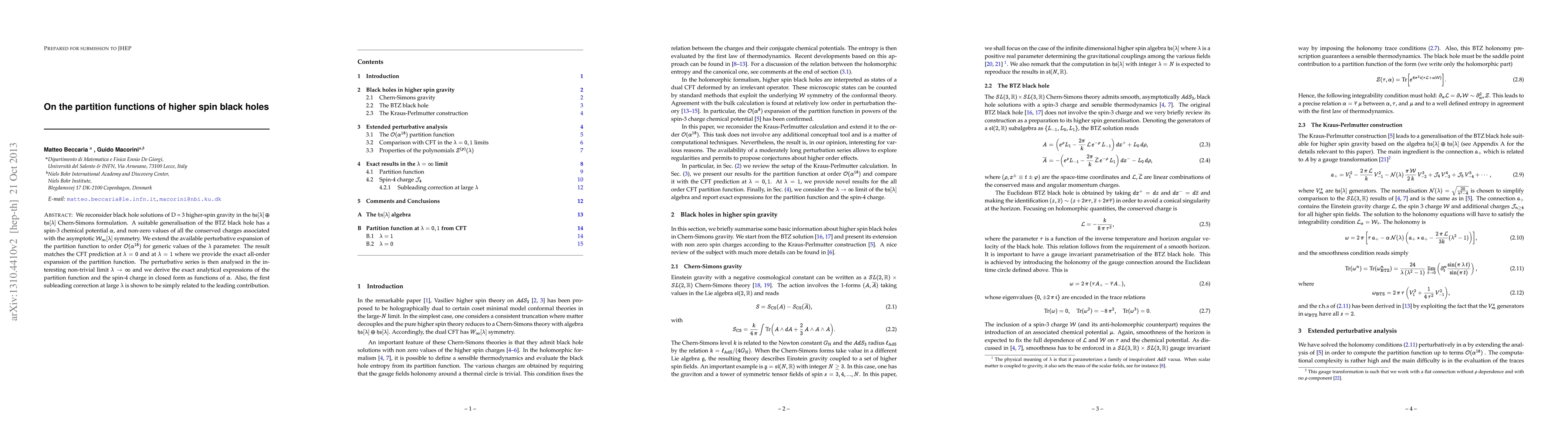 The paper extends the perturbative expansion of the partition function for higher spin black holes, derives exact expressions in specific limits, and compares results with CFT predictions, contributing to the theoretical understanding of higher spin gravity.