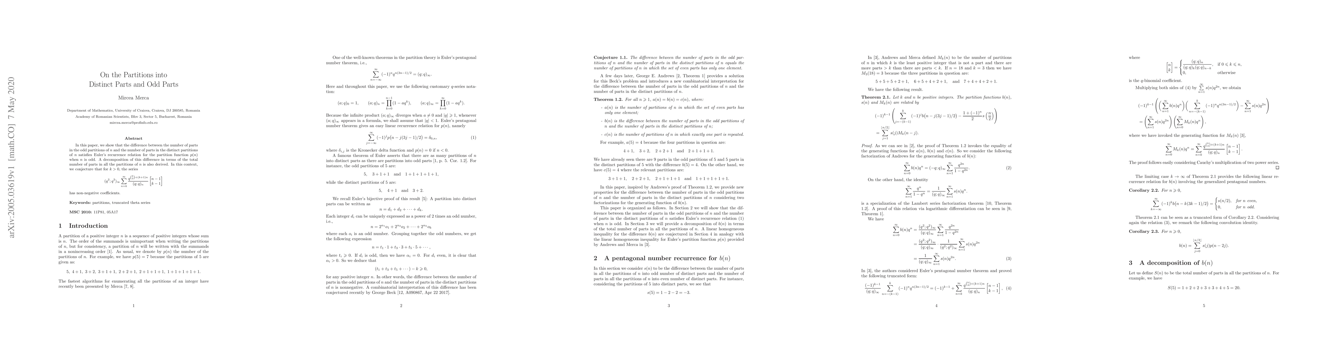 This paper demonstrates that the difference in the number of parts between odd and distinct partitions of an odd integer $n$ adheres to Euler's recurrence relation for $p(n)$. Additionally, it proposes a conjecture regarding the non-negativity of coefficients in a specific series involving partition functions.