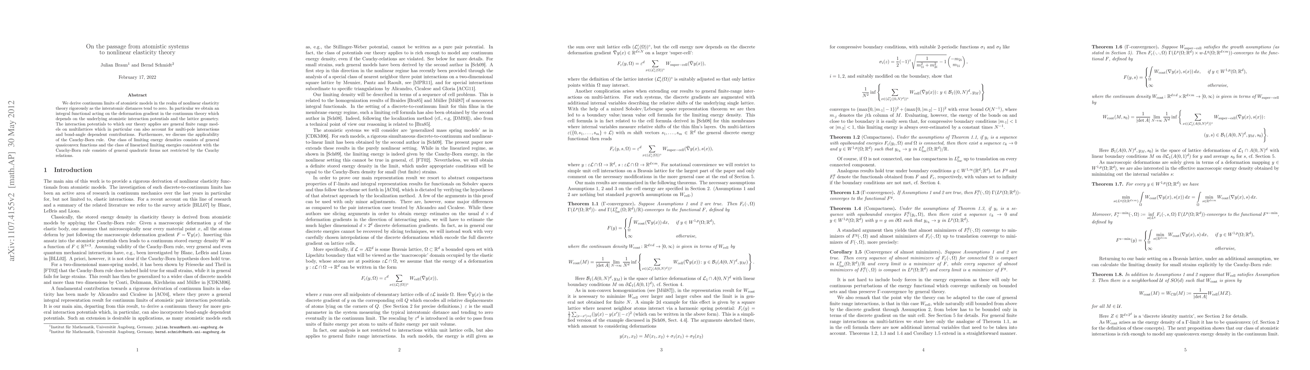 This paper rigorously derives continuum limits for atomistic models transitioning to nonlinear elasticity theory as interatomic distances approach zero. It introduces an integral functional dependent on the atomistic interaction potentials and lattice geometry, applicable to general finite range models including multi-pole interactions.