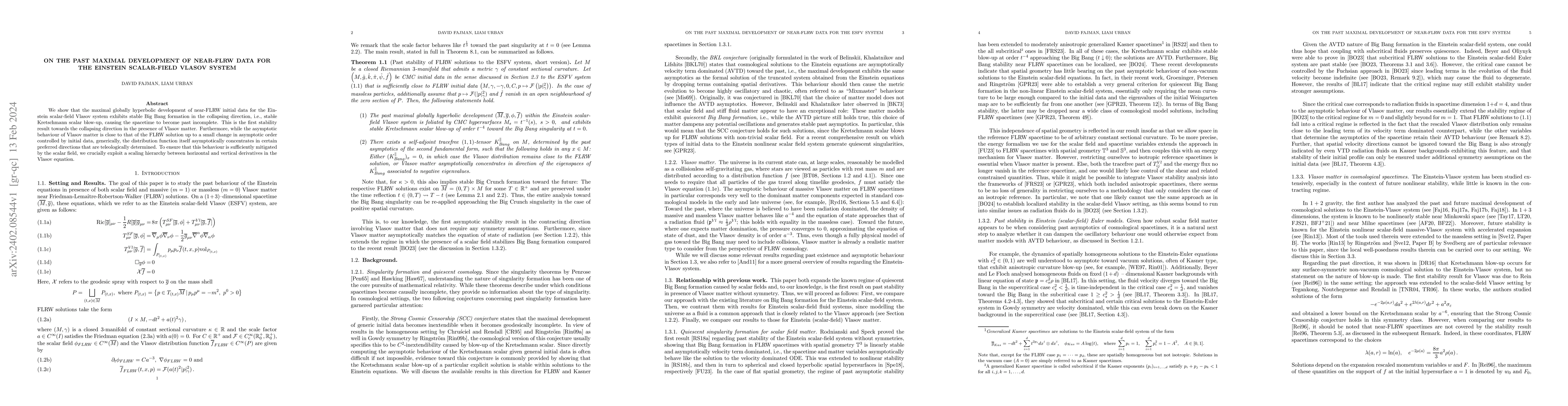 This paper demonstrates the stable formation of a Big Bang in the maximal development of near-FLRW initial data for the Einstein scalar-field Vlasov system, showing that the spacetime becomes past incomplete due to a stable Kretschmann scalar blow-up. It also reveals that the Vlasov matter asymptotically concentrates in preferred directions, mitigated by the scalar field through a scaling hierarchy.