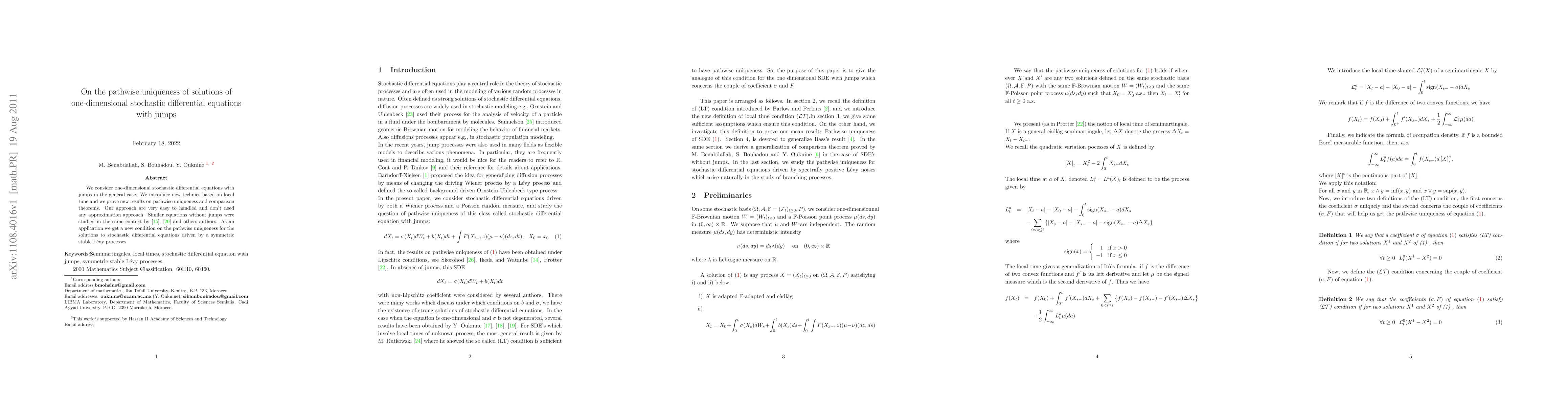 We consider one-dimensional stochastic differential equations with jumps in the general case. We introduce new technics based on local time and we prove new results on pathwise uniqueness and comparison theorems. Our approach are very easy to handled and don't need any approximation approach. Similar equations without jumps were studied in the same context by \cite{Le Gall}, \cite{Ouknine} and others authors. As an application we get a new condition on the pathwise uniqueness for the solutions to stochastic differential equations driven by a symmetric stable L\'evy processes.
