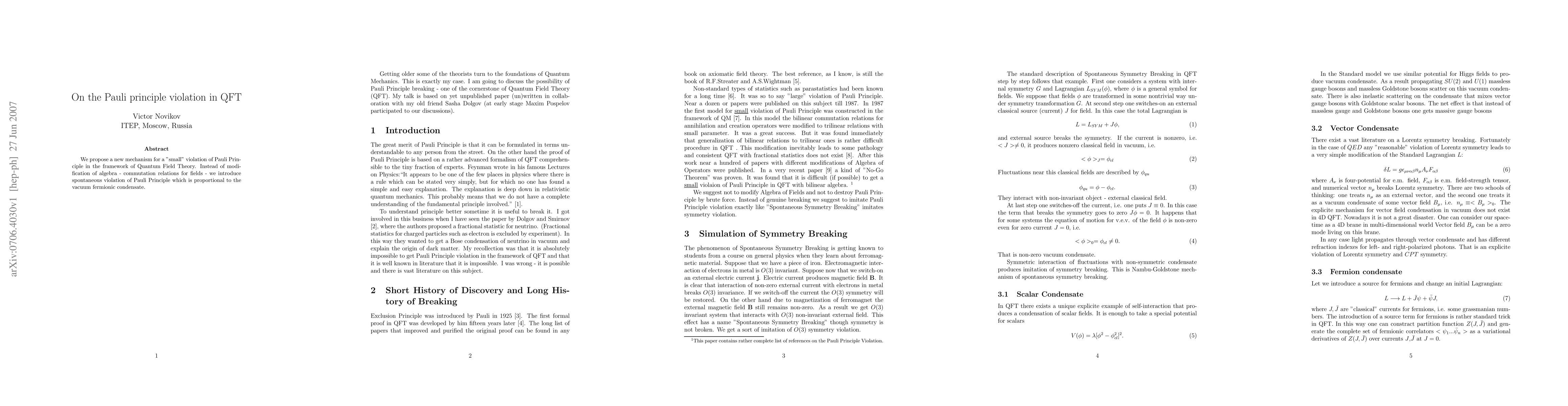 Summary: This paper proposes a novel mechanism for a minor violation of the Pauli exclusion principle within Quantum Field Theory, attributing it to spontaneous violation proportional to the vacuum fermionic condensate, rather than altering field commutation relations.