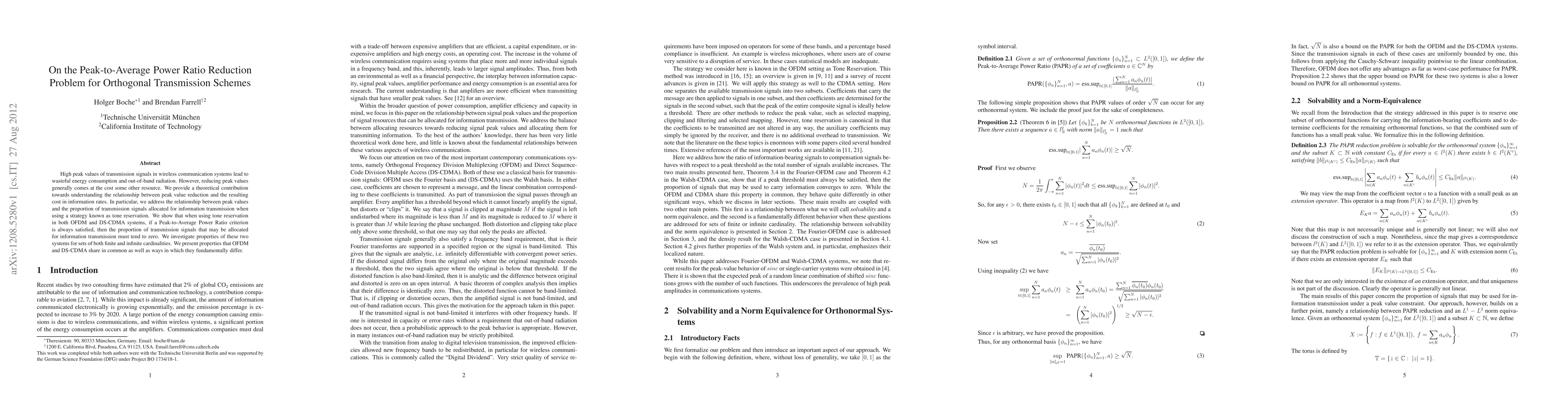 High peak values of transmission signals in wireless communication systems lead to wasteful energy consumption and out-of-band radiation. However, reducing peak values generally comes at the cost some other resource. We provide a theoretical contribution towards understanding the relationship between peak value reduction and the resulting cost in information rates. In particular, we address the relationship between peak values and the proportion of transmission signals allocated for information transmission when using a strategy known as tone reservation. We show that when using tone reservation in both OFDM and DS-CDMA systems, if a Peak-to-Average Power Ratio criterion is always satisfied, then the proportion of transmission signals that may be allocated for information transmission must tend to zero. We investigate properties of these two systems for sets of both finite and infinite cardinalities. We present properties that OFDM and DS-CDMA share in common as well as ways in which they fundamentally differ.