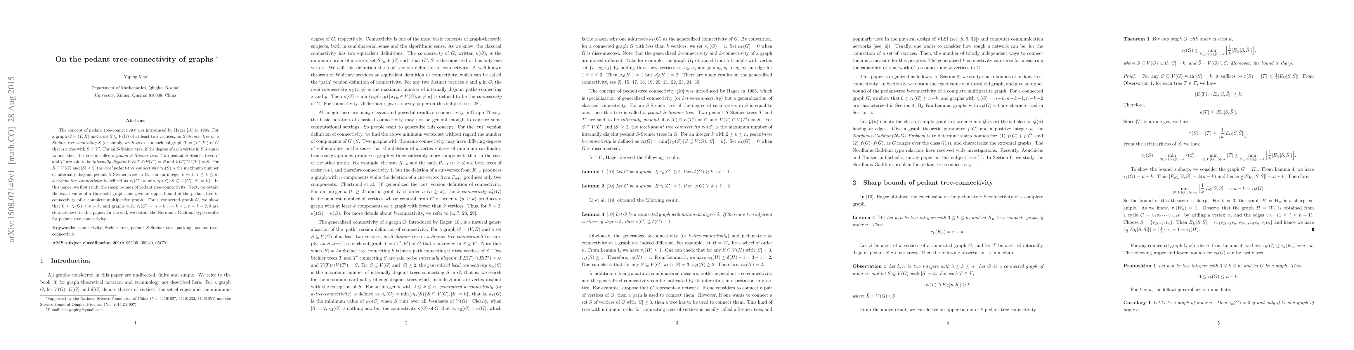 The concept of pedant tree-connectivity was introduced by Hager in 1985. For a graph $G=(V,E)$ and a set $S\subseteq V(G)$ of at least two vertices, \emph{an $S$-Steiner tree} or \emph{a Steiner tree connecting $S$} (or simply, \emph{an $S$-tree}) is a such subgraph $T=(V',E')$ of $G$ that is a tree with $S\subseteq V'$. For an $S$-Steiner tree, if the degree of each vertex in $S$ is equal to one, then this tree is called a \emph{pedant $S$-Steiner tree}. Two pedant $S$-Steiner trees $T$ and $T'$ are said to be \emph{internally disjoint} if $E(T)\cap E(T')=\varnothing$ and $V(T)\cap V(T')=S$. For $S\subseteq V(G)$ and $|S|\geq 2$, the \emph{local pedant-tree connectivity} $\tau_G(S)$ is the maximum number of internally disjoint pedant $S$-Steiner trees in $G$. For an integer $k$ with $2\leq k\leq n$, \emph{$k$-pedant tree-connectivity} is defined as $\tau_k(G)=\min\{\tau_G(S)\,|\,S\subseteq V(G),|S|=k\}$. In this paper, we first study the sharp bounds of pedant tree-connectivity. Next, we obtain the exact value of a threshold graph, and give an upper bound of the pedant-tree $k$-connectivity of a complete multipartite graph. For a connected graph $G$, we show that $0\leq \tau_k(G)\leq n-k$, and graphs with $\tau_k(G)=n-k,n-k-1,n-k-2,0$ are characterized in this paper. In the end, we obtain the Nordhaus-Guddum type results for pedant tree-connectivity.