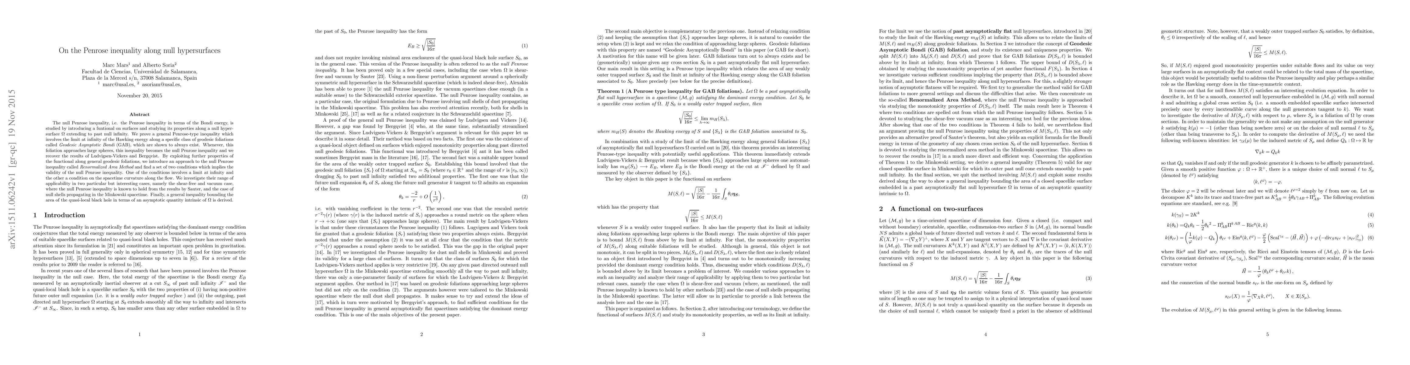 The null Penrose inequality, i.e. the Penrose inequality in terms of the Bondi energy, is studied by introducing a funtional on surfaces and studying its properties along a null hypersurface $\Omega$ extending to past null infinity. We prove a general Penrose-type inequality which involves the limit at infinity of the Hawking energy along a specific class of geodesic foliations called Geodesic Asymptotic Bondi (GAB), which are shown to always exist. Whenever, this foliation approaches large spheres, this inequality becomes the null Penrose inequality and we recover the results of Ludvigsen-Vickers and Bergqvist. By exploiting further properties of the functional along general geodesic foliations, we introduce an approach to the null Penrose inequality called Renormalized Area Method and find a set of two conditions which implies the validity of the null Penrose inequality. One of the conditions involves a limit at infinity and the other a condition on the spacetime curvature along the flow. We investigate their range of applicability in two particular but interesting cases, namely the shear-free and vacuum case, where the null Penrose inequality is known to hold from the results by Sauter, and the case of null shells propagating in the Minkowski spacetime. Finally, a general inequality bounding the area of the quasi-local black hole in terms of an asymptotic quantity intrinsic of $\Omega$ is derived.