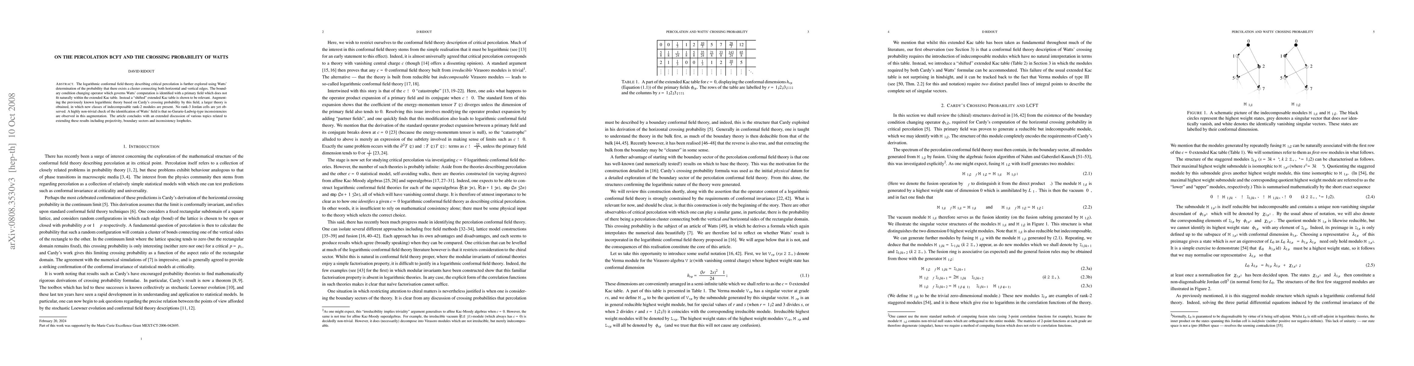 The logarithmic conformal field theory describing critical percolation is further explored using Watts' determination of the probability that there exists a cluster connecting both horizontal and vertical edges. The boundary condition changing operator which governs Watts' computation is identified with a primary field which does not fit naturally within the extended Kac table. Instead a "shifted" extended Kac table is shown to be relevant. Augmenting the previously known logarithmic theory based on Cardy's crossing probability by this field, a larger theory is obtained, in which new classes of indecomposable rank-2 modules are present. No rank-3 Jordan cells are yet observed. A highly non-trivial check of the identification of Watts' field is that no Gurarie-Ludwig-type inconsistencies are observed in this augmentation. The article concludes with an extended discussion of various topics related to extending these results including projectivity, boundary sectors and inconsistency loopholes.