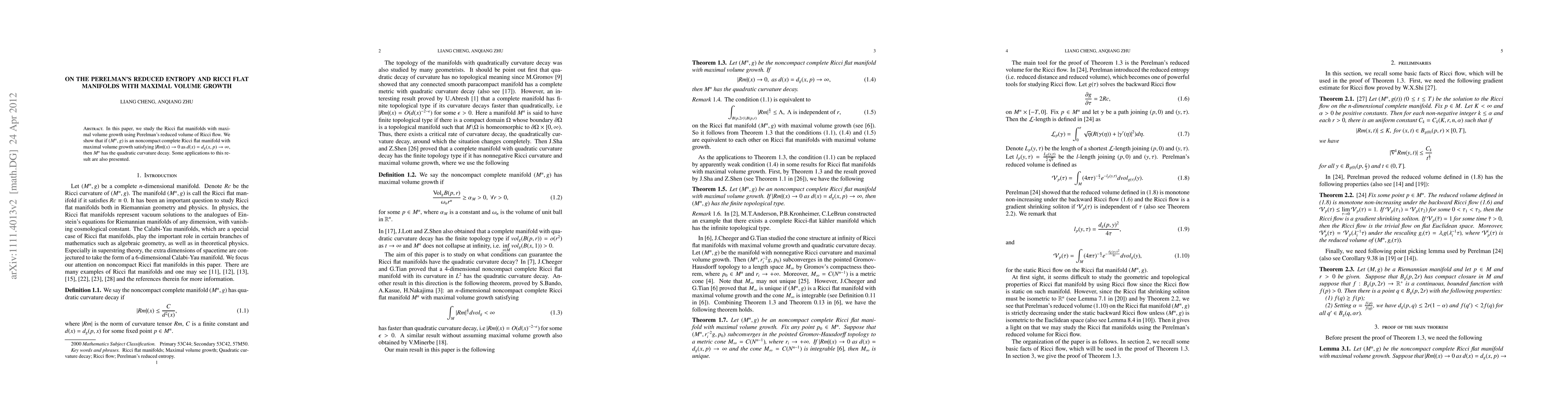 This paper investigates Ricci flat manifolds with maximal volume growth using Perelman's reduced volume in Ricci flow, proving that such manifolds exhibit quadratic curvature decay under certain conditions. Applications of this result are also discussed.