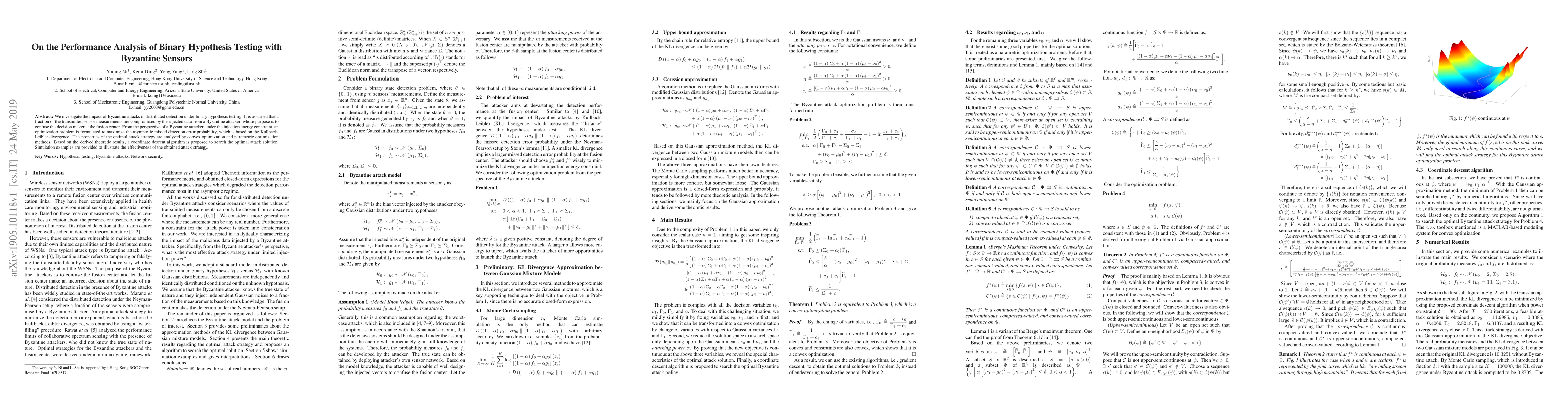 This paper analyzes the performance of binary hypothesis testing in distributed detection under the threat of Byzantine attacks, where some sensor measurements are compromised. It formulates an optimization problem to maximize the missed detection error, analyzes the optimal attack strategy using convex and parametric optimization, and proposes a coordinate descent algorithm to find the optimal attack solution, validated through simulations.