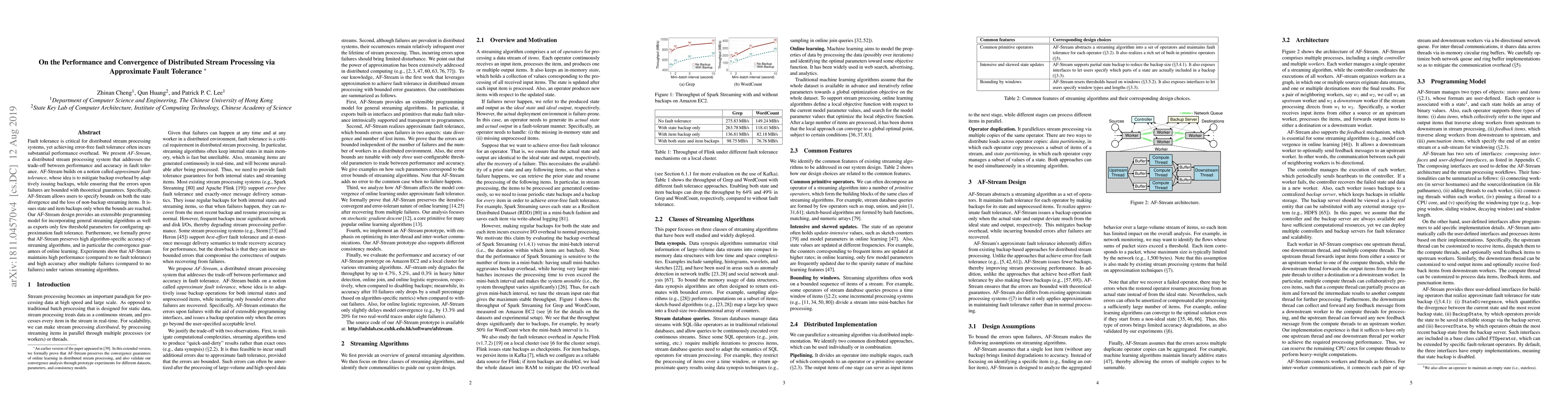 This paper introduces AF-Stream, a distributed stream processing system that employs approximate fault tolerance to balance performance and accuracy. AF-Stream adaptively issues backups to ensure bounded error upon failures, allowing users to specify error bounds for state divergence and non-backup items, thus maintaining high performance and algorithm-specific accuracy.