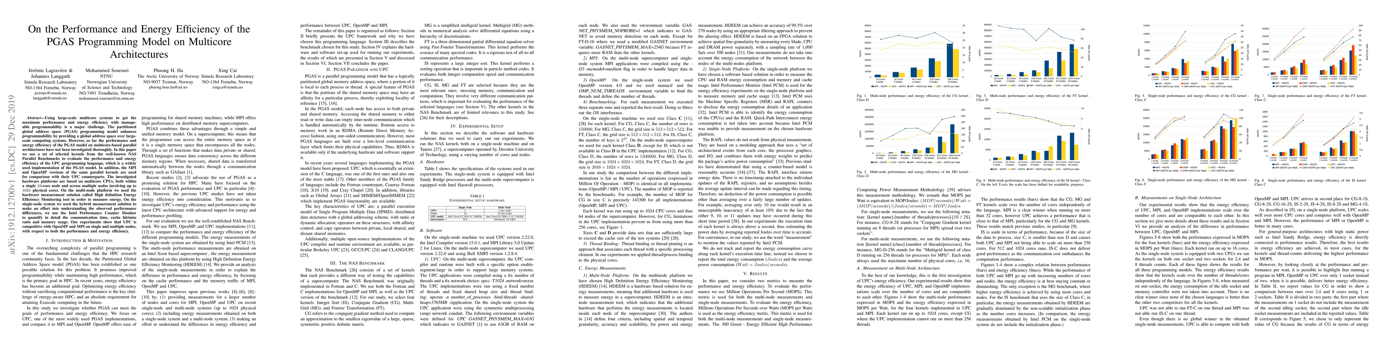 This paper evaluates the performance and energy efficiency of the UPC programming language, which implements the PGAS model, on multicore architectures compared to MPI and OpenMP. Results show that UPC is competitive with OpenMP and MPI in terms of both performance and energy efficiency across single and multi-node systems.