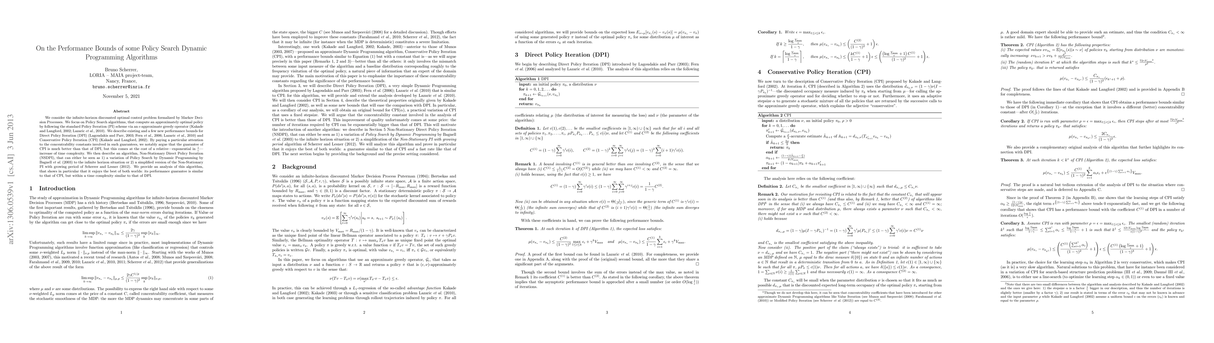 We consider the infinite-horizon discounted optimal control problem formalized by Markov Decision Processes. We focus on Policy Search algorithms, that compute an approximately optimal policy by following the standard Policy Iteration (PI) scheme via an -approximate greedy operator (Kakade and Langford, 2002; Lazaric et al., 2010). We describe existing and a few new performance bounds for Direct Policy Iteration (DPI) (Lagoudakis and Parr, 2003; Fern et al., 2006; Lazaric et al., 2010) and Conservative Policy Iteration (CPI) (Kakade and Langford, 2002). By paying a particular attention to the concentrability constants involved in such guarantees, we notably argue that the guarantee of CPI is much better than that of DPI, but this comes at the cost of a relative--exponential in $\frac{1}{\epsilon}$-- increase of time complexity. We then describe an algorithm, Non-Stationary Direct Policy Iteration (NSDPI), that can either be seen as 1) a variation of Policy Search by Dynamic Programming by Bagnell et al. (2003) to the infinite horizon situation or 2) a simplified version of the Non-Stationary PI with growing period of Scherrer and Lesner (2012). We provide an analysis of this algorithm, that shows in particular that it enjoys the best of both worlds: its performance guarantee is similar to that of CPI, but within a time complexity similar to that of DPI.
