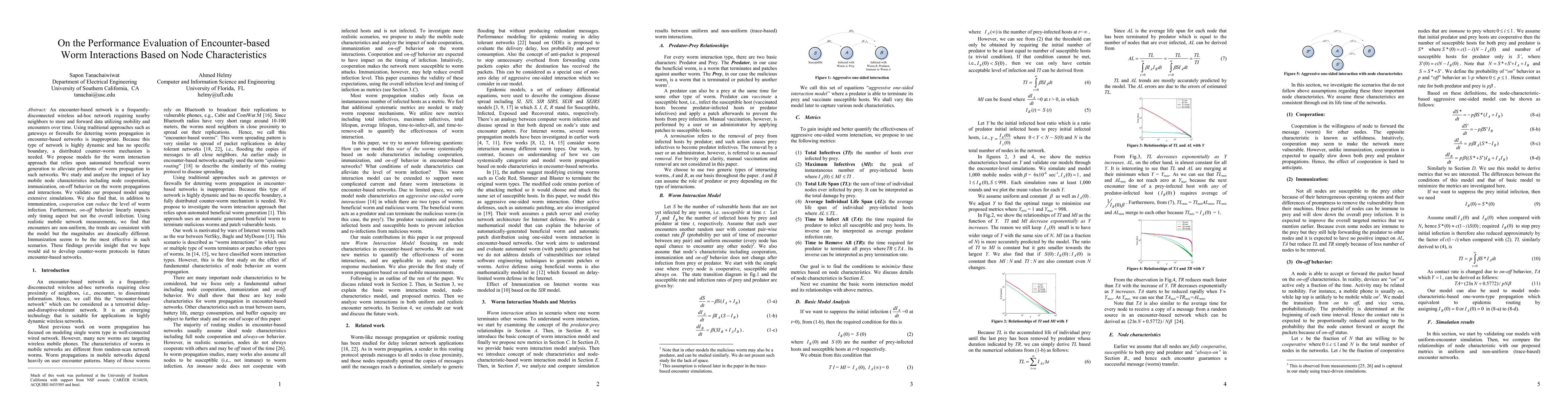 An encounter-based network is a frequently disconnected wireless ad-hoc network requiring nearby neighbors to store and forward data utilizing mobility and encounters over time. Using traditional approaches such as gateways or firewalls for deterring worm propagation in encounter-based networks is inappropriate. Because this type of network is highly dynamic and has no specific boundary, a distributed counter-worm mechanism is needed. We propose models for the worm interaction approach that relies upon automated beneficial worm generation to alleviate problems of worm propagation in such networks. We study and analyze the impact of key mobile node characteristics including node cooperation, immunization, on-off behavior on the worm propagations and interactions. We validate our proposed model using extensive simulations. We also find that, in addition to immunization, cooperation can reduce the level of worm infection. Furthermore, on-off behavior linearly impacts only timing aspect but not the overall infection. Using realistic mobile network measurements, we find that encounters are non-uniform, the trends are consistent with the model but the magnitudes are drastically different. Immunization seems to be the most effective in such scenarios. These findings provide insight that we hope would aid to develop counter-worm protocols in future encounter-based networks.