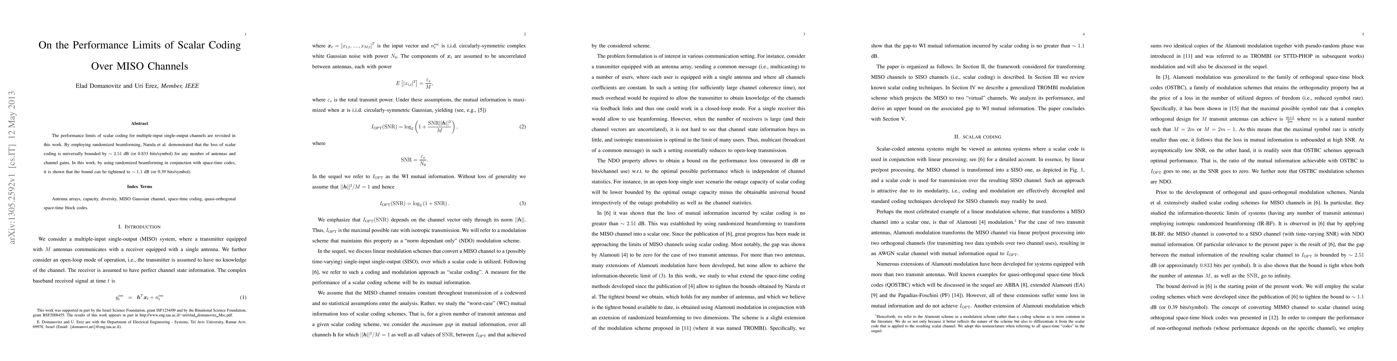 The performance limits of scalar coding for multiple-input single-output channels are revisited in this work. By employing randomized beamforming, Narula et al. demonstrated that the loss of scalar coding is universally bounded by ~ 2.51 dB (or 0.833 bits/symbol) for any number of antennas and channel gains. In this work, by using randomized beamforming in conjunction with space-time codes, it is shown that the bound can be tightened to ~ 1.1 dB (or 0.39 bits/symbol).