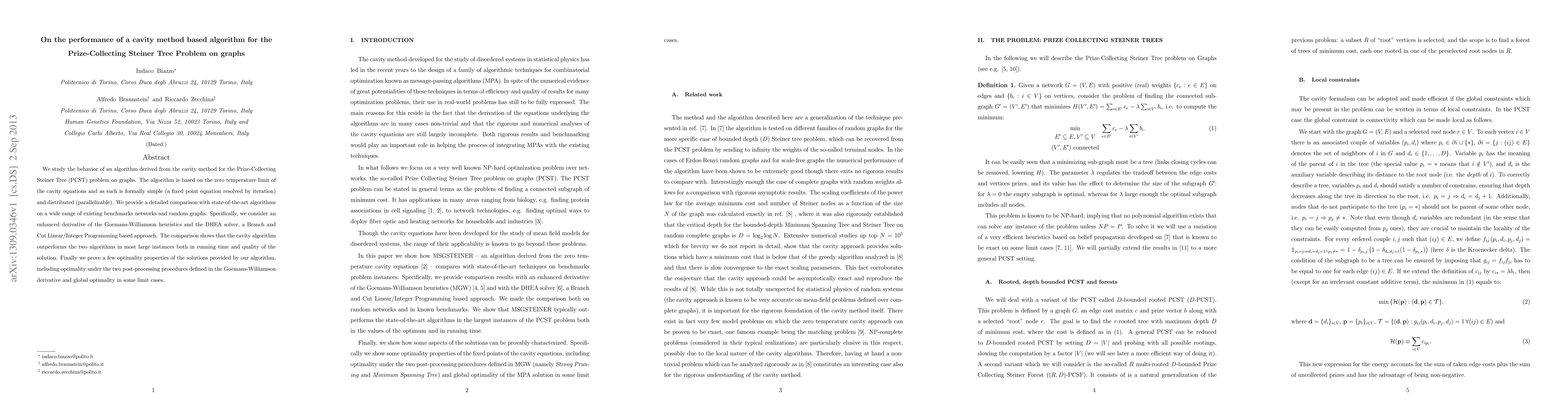 We study the behavior of an algorithm derived from the cavity method for the Prize-Collecting Steiner Tree (PCST) problem on graphs. The algorithm is based on the zero temperature limit of the cavity equations and as such is formally simple (a fixed point equation resolved by iteration) and distributed (parallelizable). We provide a detailed comparison with state-of-the-art algorithms on a wide range of existing benchmarks networks and random graphs. Specifically, we consider an enhanced derivative of the Goemans-Williamson heuristics and the DHEA solver, a Branch and Cut Linear/Integer Programming based approach. The comparison shows that the cavity algorithm outperforms the two algorithms in most large instances both in running time and quality of the solution. Finally we prove a few optimality properties of the solutions provided by our algorithm, including optimality under the two post-processing procedures defined in the Goemans-Williamson derivative and global optimality in some limit cases.