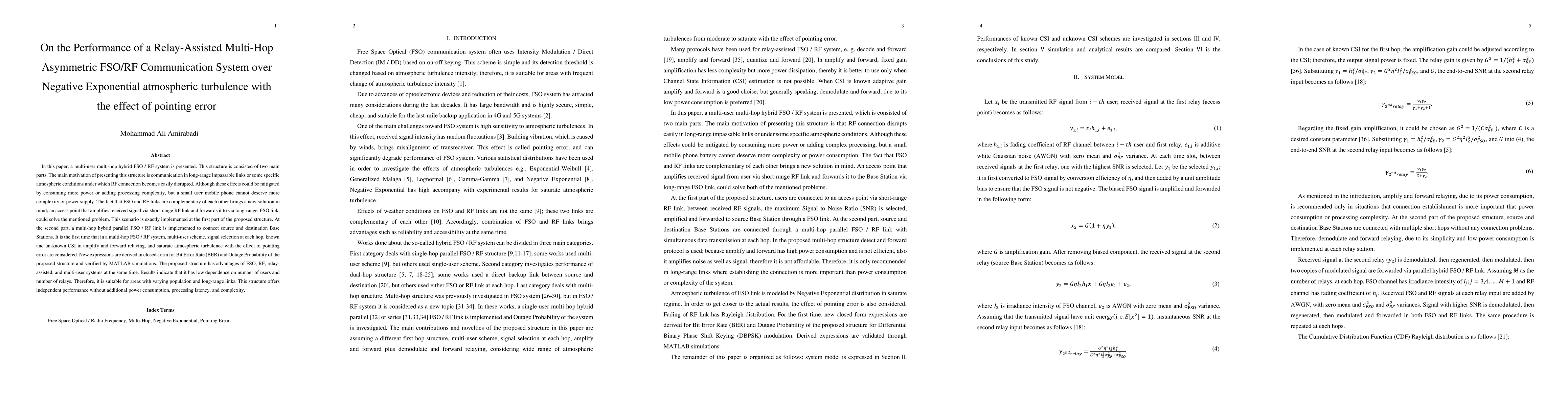 In this paper, a multi-user multi-hop hybrid FSO / RF system is presented. This structure is consisted of two main parts. The main motivation of presenting this structure is communication in long-range impassable links or some specific atmospheric conditions under which RF connection becomes easily disrupted. Although these effects could be mitigated by consuming more power or adding processing complexity, but a small user mobile phone cannot deserve more complexity or power supply. The fact that FSO and RF links are complementary of each other brings a new solution in mind; an access point that amplifies received signal via short-range RF link and forwards it to via long-range FSO link, could solve the mentioned problem. This scenario is exactly implemented at the first part of the proposed structure. At the second part, a multi-hop hybrid parallel FSO / RF link is implemented to connect source and destination Base Stations. It is the first time that in a multi-hop FSO / RF system, multi-user scheme, signal selection at each hop, known and un-known CSI in amplify and forward relaying, and saturate atmospheric turbulence with the effect of pointing error are considered. New expressions are derived in closed-form for Bit Error Rate (BER) and Outage Probability of the proposed structure and verified by MATLAB simulations. The proposed structure has advantages of FSO, RF, relay-assisted, and multi-user systems at the same time. Results indicate that it has low dependence on number of users and number of relays. Therefore, it is suitable for areas with varying population and long-range links. This structure offers independent performance without additional power consumption, processing latency, and complexity.