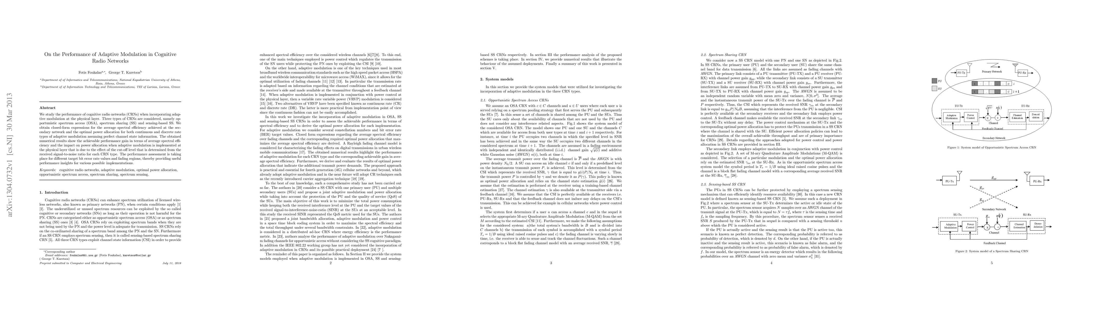 This paper evaluates the performance of adaptive modulation in cognitive radio networks (CRNs), focusing on three types: opportunistic spectrum access, spectrum sharing, and sensing-based sharing. It derives expressions for average spectral efficiency and optimal power allocation under adaptive modulation, revealing performance gains and the impact of modulation on power allocation based on received signal-to-noise ratio.