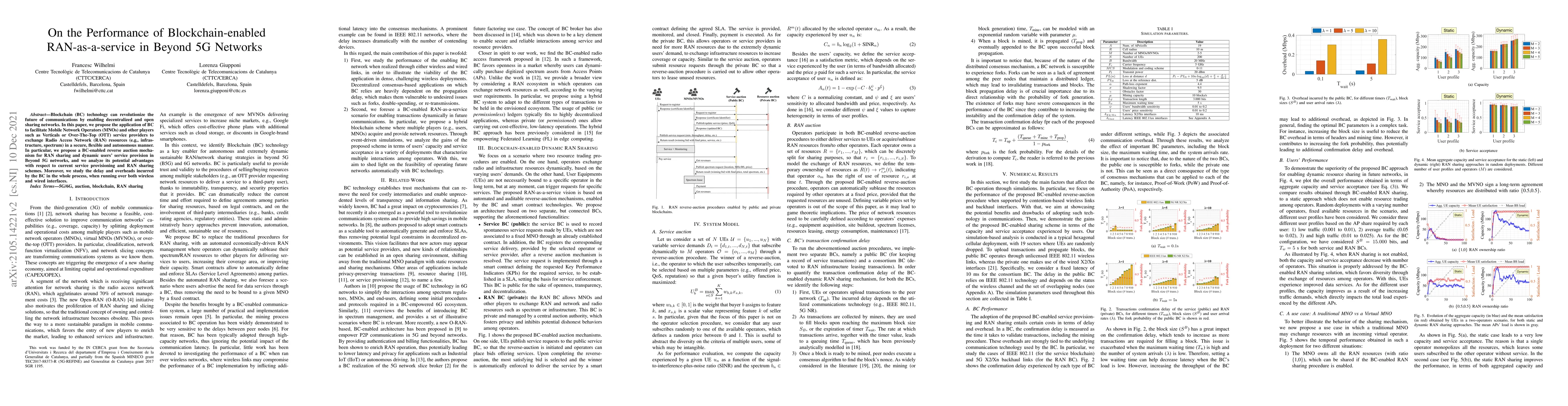 Blockchain (BC) technology can revolutionize the future of communications by enabling decentralized and open sharing networks. In this paper, we propose the application of BC to facilitate Mobile Network Operators (MNOs) and other players such as Verticals or Over-The-Top (OTT) service providers to exchange Radio Access Network (RAN) resources (e.g., infrastructure, spectrum) in a secure, flexible and autonomous manner. In particular, we propose a BC-enabled reverse auction mechanism for RAN sharing and dynamic users' service provision in Beyond 5G networks, and we analyze its potential advantages with respect to current service provisioning and RAN sharing schemes. Moreover, we study the delay and overheads incurred by the BC in the whole process, when running over both wireless and wired interfaces.