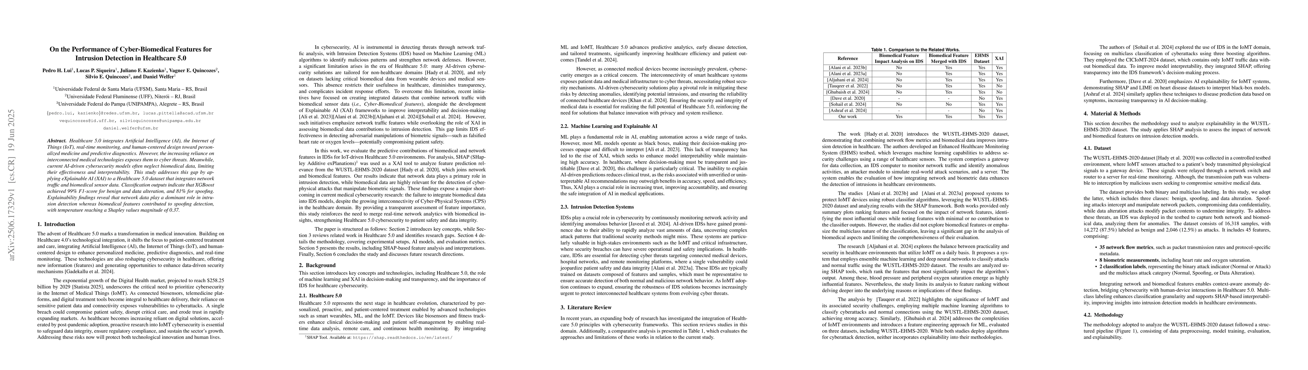 Healthcare 5.0 integrates Artificial Intelligence (AI), the Internet of Things (IoT), real-time monitoring, and human-centered design toward personalized medicine and predictive diagnostics. However, the increasing reliance on interconnected medical technologies exposes them to cyber threats. Meanwhile, current AI-driven cybersecurity models often neglect biomedical data, limiting their effectiveness and interpretability. This study addresses this gap by applying eXplainable AI (XAI) to a Healthcare 5.0 dataset that integrates network traffic and biomedical sensor data. Classification outputs indicate that XGBoost achieved 99% F1-score for benign and data alteration, and 81% for spoofing. Explainability findings reveal that network data play a dominant role in intrusion detection whereas biomedical features contributed to spoofing detection, with temperature reaching a Shapley values magnitude of 0.37.