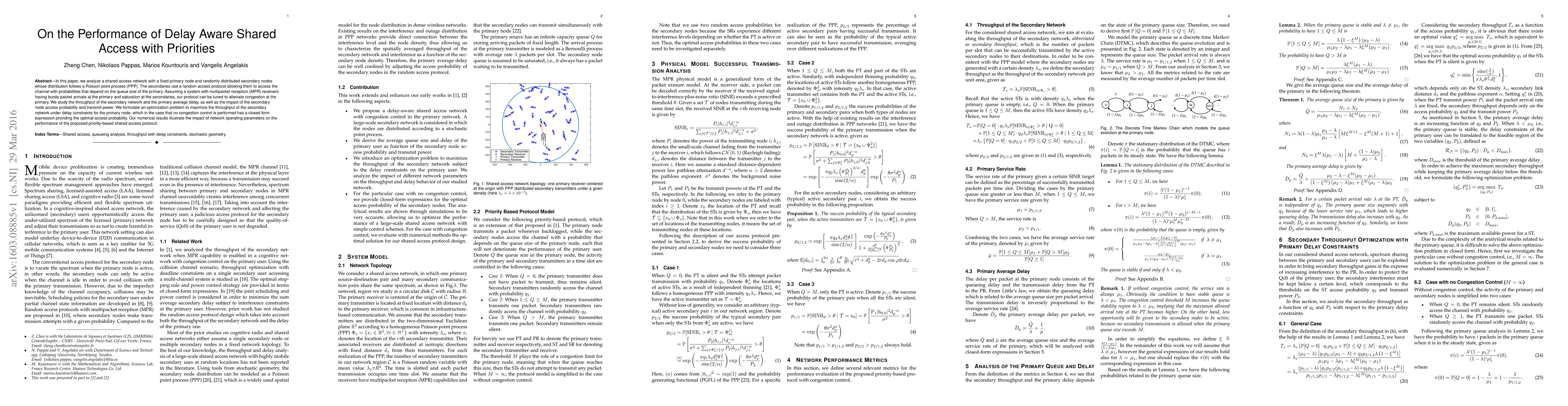 This paper examines a shared access network with a primary node and randomly distributed secondary nodes, analyzing throughput and average delay under a priority-based random access protocol. The study optimizes secondary network throughput while managing primary node delay, revealing the impact of access probability and transmit power on performance.