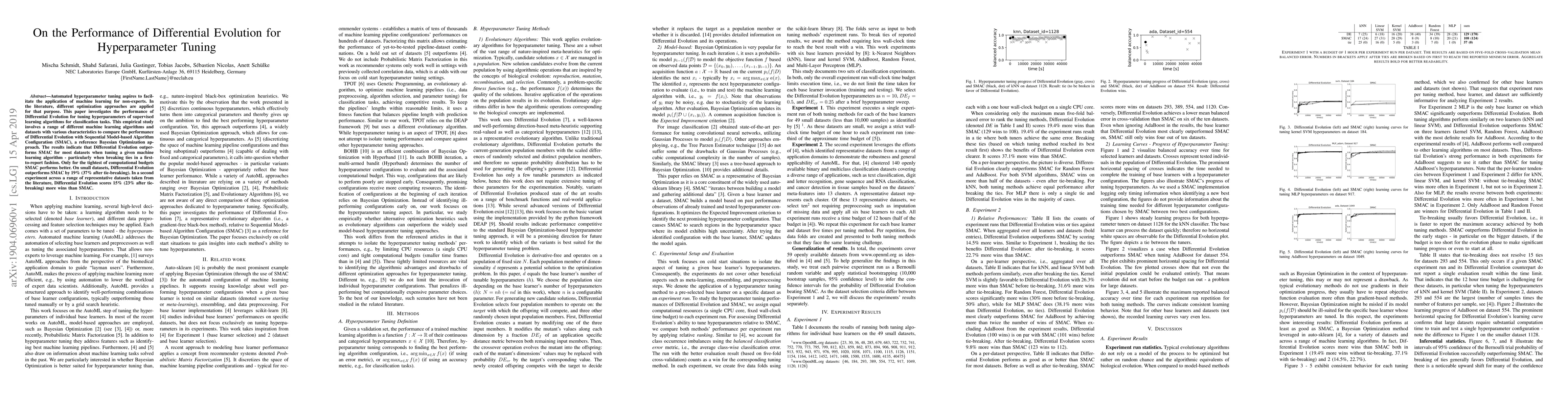 Automated hyperparameter tuning aspires to facilitate the application of machine learning for non-experts. In the literature, different optimization approaches are applied for that purpose. This paper investigates the performance of Differential Evolution for tuning hyperparameters of supervised learning algorithms for classification tasks. This empirical study involves a range of different machine learning algorithms and datasets with various characteristics to compare the performance of Differential Evolution with Sequential Model-based Algorithm Configuration (SMAC), a reference Bayesian Optimization approach. The results indicate that Differential Evolution outperforms SMAC for most datasets when tuning a given machine learning algorithm - particularly when breaking ties in a first-to-report fashion. Only for the tightest of computational budgets SMAC performs better. On small datasets, Differential Evolution outperforms SMAC by 19% (37% after tie-breaking). In a second experiment across a range of representative datasets taken from the literature, Differential Evolution scores 15% (23% after tie-breaking) more wins than SMAC.