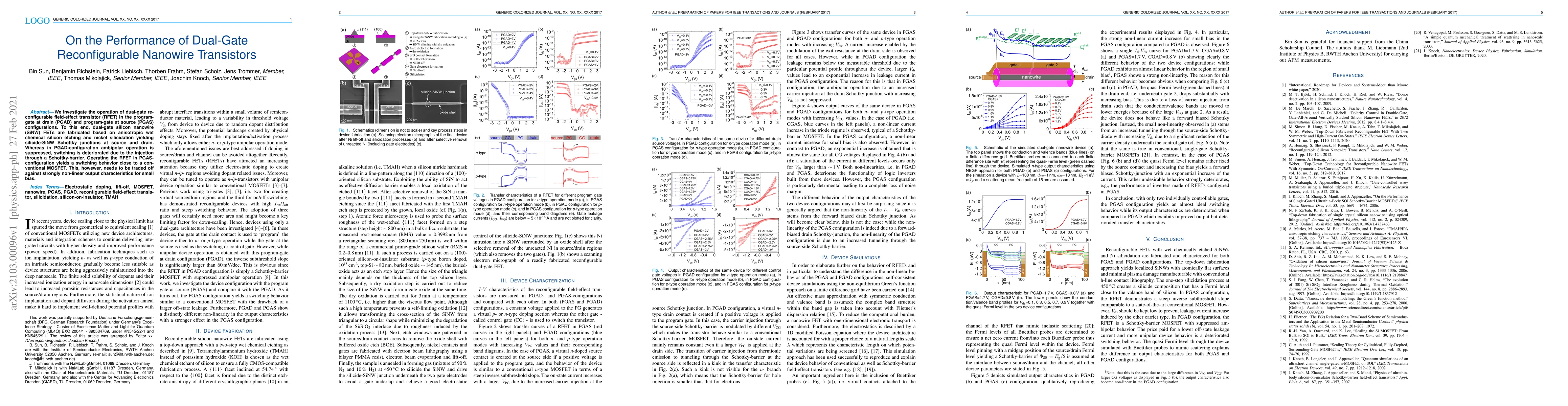 This paper examines dual-gate reconfigurable field-effect transistors (RFETs) in PGAD and PGAS configurations, finding that while PGAS offers switching akin to conventional MOSFETs, it results in non-linear output characteristics at low biases.