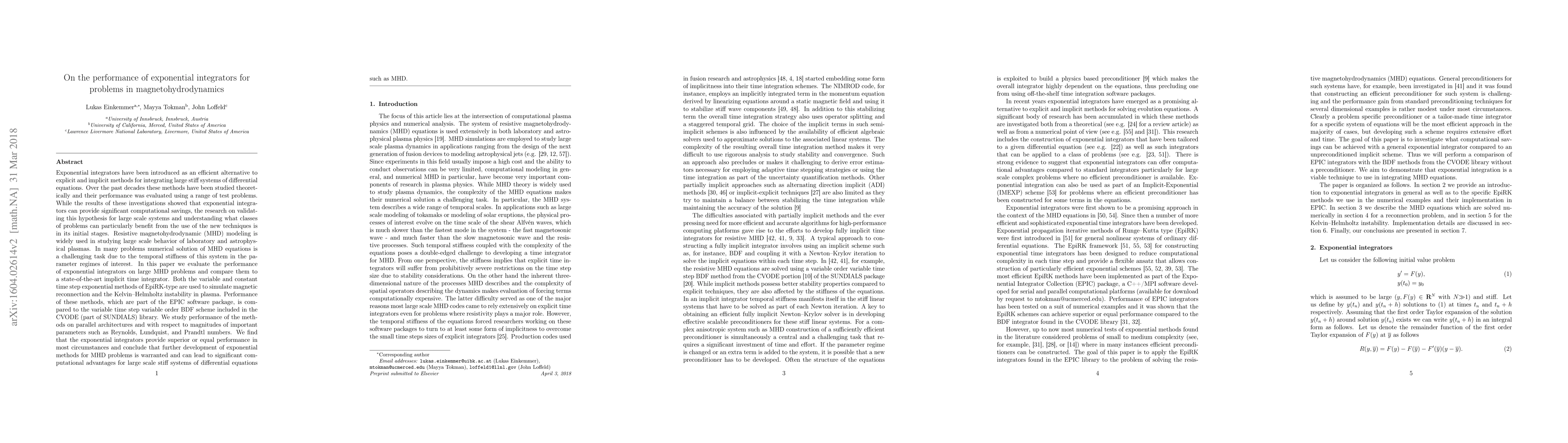 This paper evaluates the performance of exponential integrators for solving large-scale magnetohydrodynamic (MHD) problems, comparing them to a state-of-the-art implicit method. The study finds that exponential integrators offer superior or equal performance, suggesting significant computational benefits for large stiff systems like MHD.