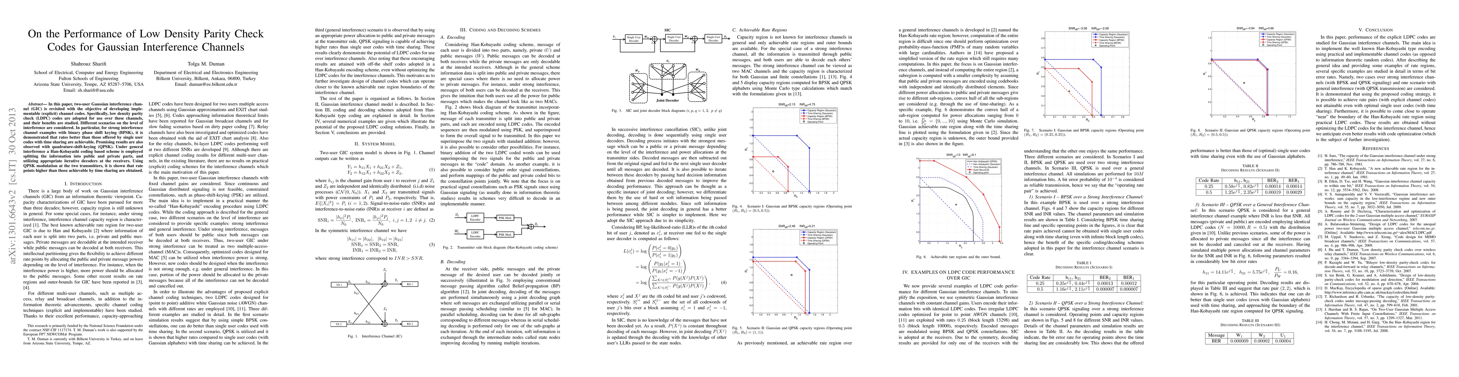 The paper studies the performance of Low Density Parity Check (LDPC) codes for Gaussian Interference Channels (GIC) using Han-Kobayashi coding scheme, employing Belief Propagation (BP) decoding algorithm. It considers different interference scenarios, including strong interference and general interference, with Binary Phase Shift Keying (BPSK) and Quadrature Phase Shift Keying (QPSK) modulation.