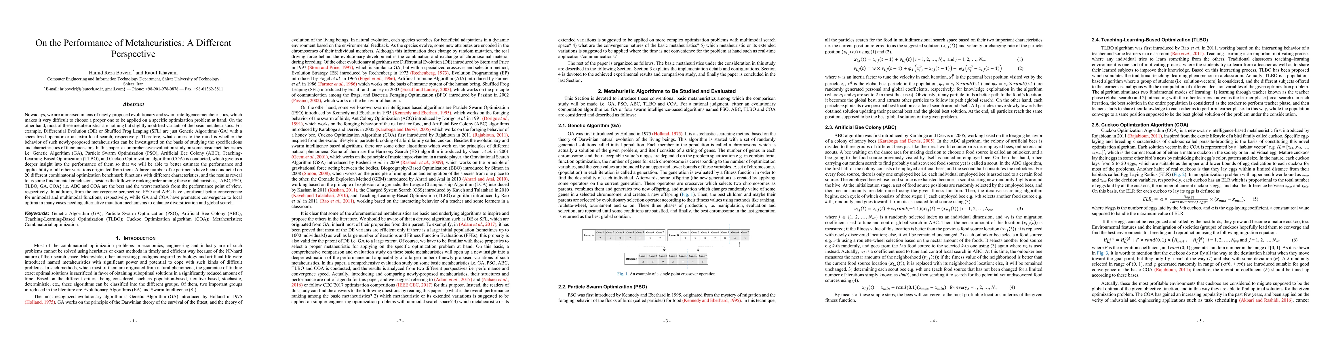 Nowadays, we are immersed in tens of newly-proposed evolutionary and swam-intelligence metaheuristics, which makes it very difficult to choose a proper one to be applied on a specific optimization problem at hand. On the other hand, most of these metaheuristics are nothing but slightly modified variants of the basic metaheuristics. For example, Differential Evolution (DE) or Shuffled Frog Leaping (SFL) are just Genetic Algorithms (GA) with a specialized operator or an extra local search, respectively. Therefore, what comes to the mind is whether the behavior of such newly-proposed metaheuristics can be investigated on the basis of studying the specifications and characteristics of their ancestors. In this paper, a comprehensive evaluation study on some basic metaheuristics i.e. Genetic Algorithm (GA), Particle Swarm Optimization (PSO), Artificial Bee Colony (ABC), Teaching-Learning-Based Optimization (TLBO), and Cuckoo Optimization algorithm (COA) is conducted, which give us a deeper insight into the performance of them so that we will be able to better estimate the performance and applicability of all other variations originated from them. A large number of experiments have been conducted on 20 different combinatorial optimization benchmark functions with different characteristics, and the results reveal to us some fundamental conclusions besides the following ranking order among these metaheuristics, {ABC, PSO, TLBO, GA, COA} i.e. ABC and COA are the best and the worst methods from the performance point of view, respectively. In addition, from the convergence perspective, PSO and ABC have significant better convergence for unimodal and multimodal functions, respectively, while GA and COA have premature convergence to local optima in many cases needing alternative mutation mechanisms to enhance diversification and global search.