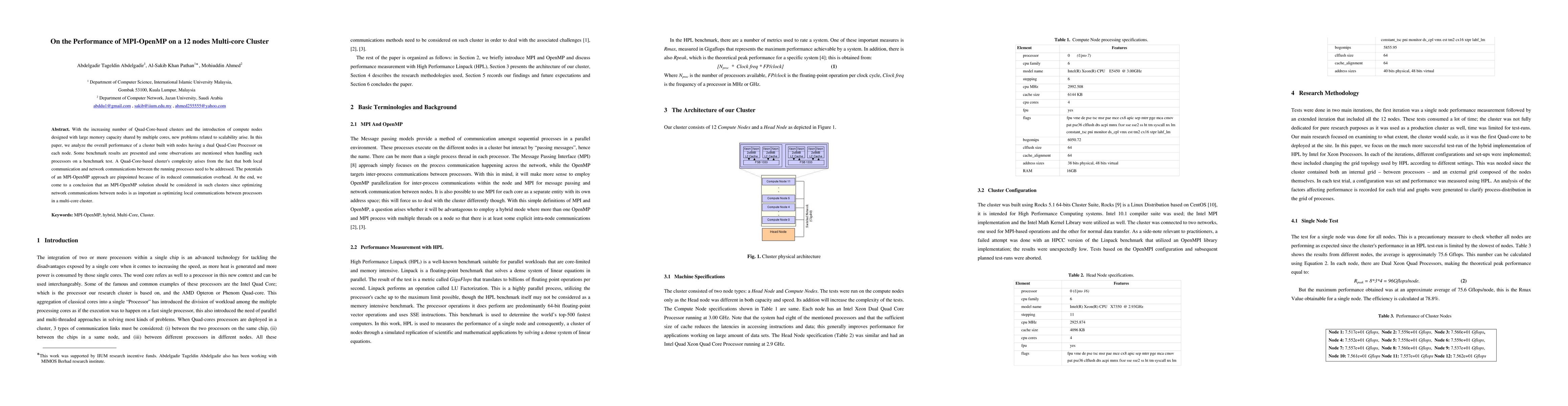 This paper evaluates the performance of MPI-OpenMP on a 12-node multi-core cluster with dual Quad-Core processors, highlighting the reduced communication overhead and the importance of optimizing both local and network communications for scalability. The study concludes that an MPI-OpenMP approach is beneficial for such clusters.