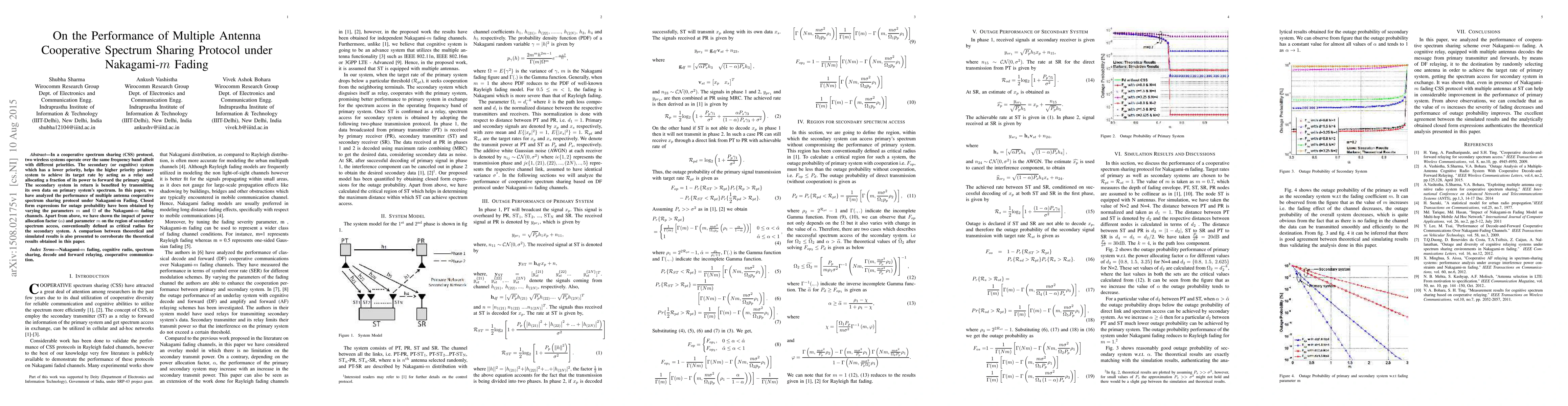 This paper analyzes the performance of a multiple antenna cooperative spectrum sharing protocol under Nakagami-m fading conditions, deriving closed-form expressions for outage probability. It examines the impact of fading parameters and power allocation on secondary spectrum access, and validates theoretical results with simulations.
