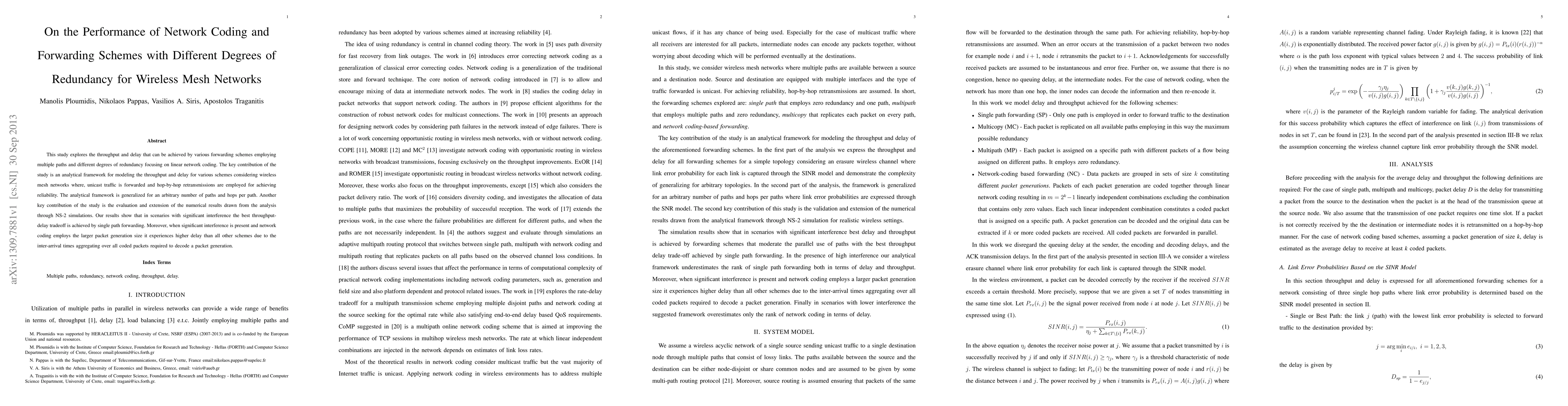 This study explores the throughput and delay that can be achieved by various forwarding schemes employing multiple paths and different degrees of redundancy focusing on linear network coding. The key contribution of the study is an analytical framework for modeling the throughput and delay for various schemes considering wireless mesh networks where, unicast traffic is forwarded and hop-by-hop retransmissions are employed for achieving reliability. The analytical framework is generalized for an arbitrary number of paths and hops per path. Another key contribution of the study is the evaluation and extension of the numerical results drawn from the analysis through NS-2 simulations. Our results show that in scenarios with significant interference the best throughput-delay tradeoff is achieved by single path forwarding. Moreover, when significant interference is present and network coding employs the larger packet generation size it experiences higher delay than all other schemes due to the inter-arrival times aggregating over all coded packets required to decode a packet generation.