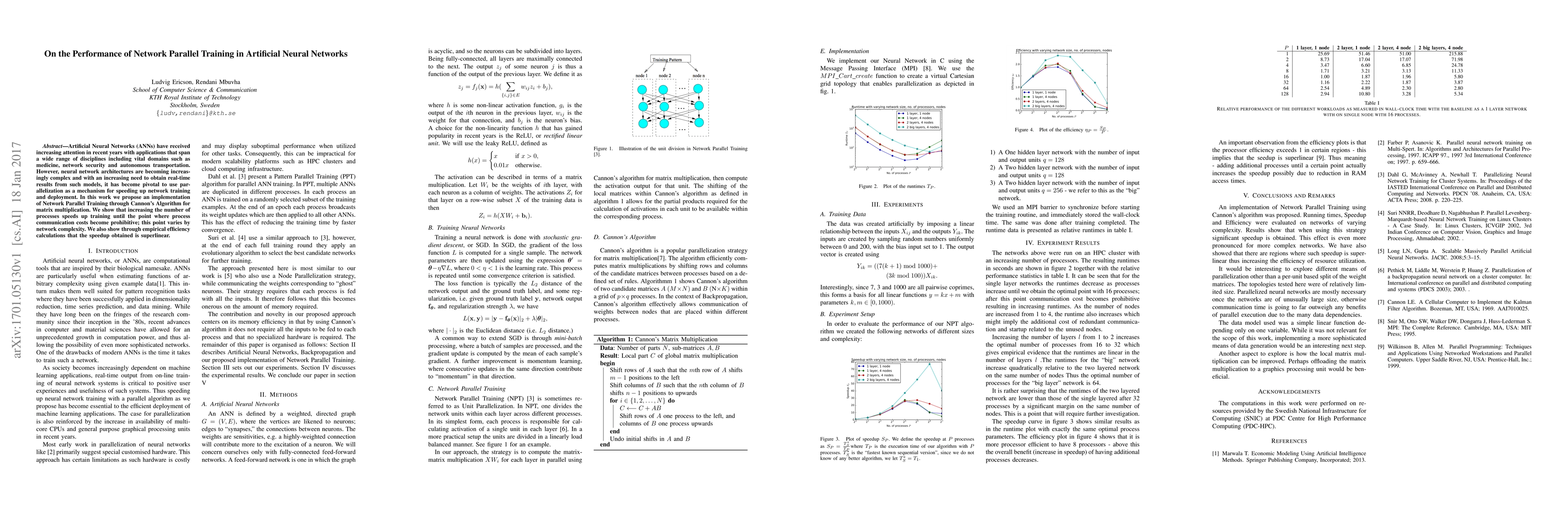 This paper proposes an implementation of Network Parallel Training using Cannon's Algorithm for matrix multiplication to speed up training of complex Artificial Neural Networks. The study finds that while increasing the number of parallel processes enhances training speed, communication costs eventually become prohibitive, leading to diminishing returns, and demonstrates superlinear speedup.