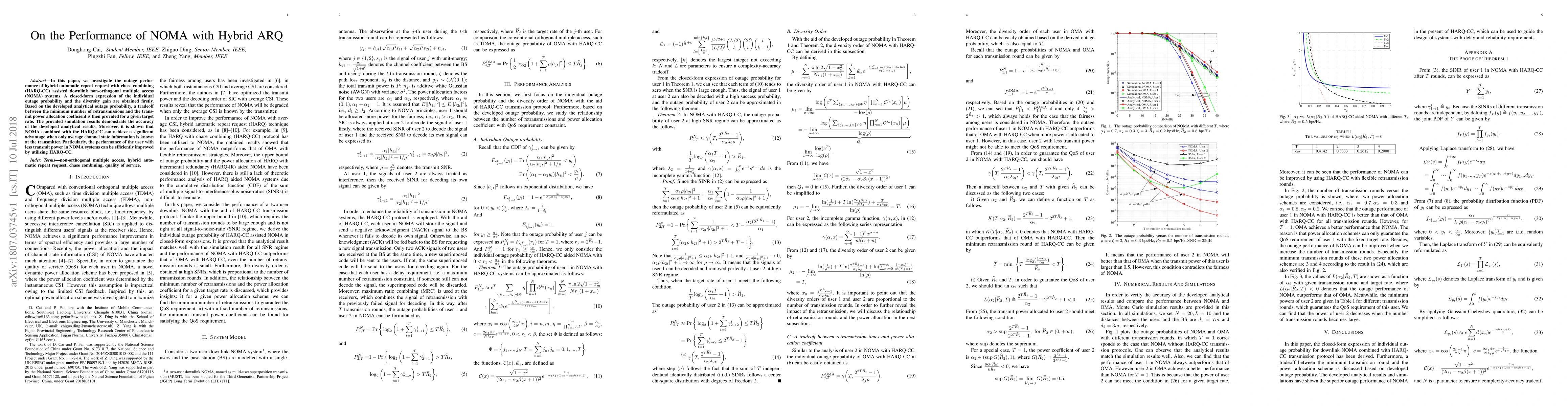 This paper analyzes the outage performance of NOMA systems using HARQ-CC, deriving closed-form expressions for outage probability and diversity gain. It demonstrates that NOMA with HARQ-CC can significantly improve performance, especially for users with less transmit power, when only average channel state information is available.
