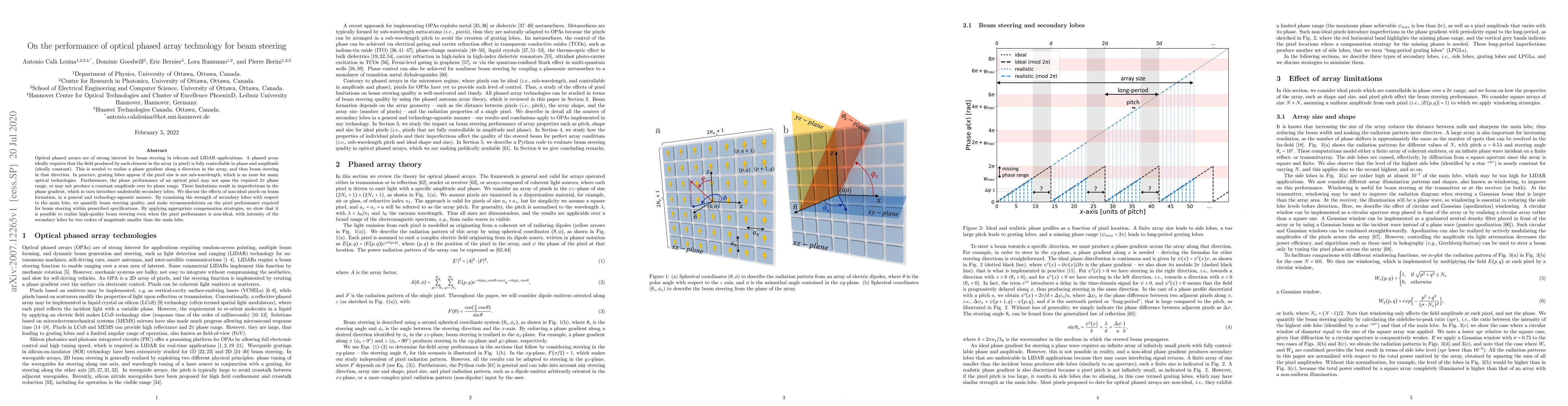This paper investigates the performance of optical phased arrays for beam steering, highlighting the challenges posed by non-ideal pixels, such as grating lobes and amplitude inconsistencies. It proposes compensation strategies to achieve high-quality beam steering, demonstrating that secondary lobes can be minimized to two orders of magnitude below the main lobe.