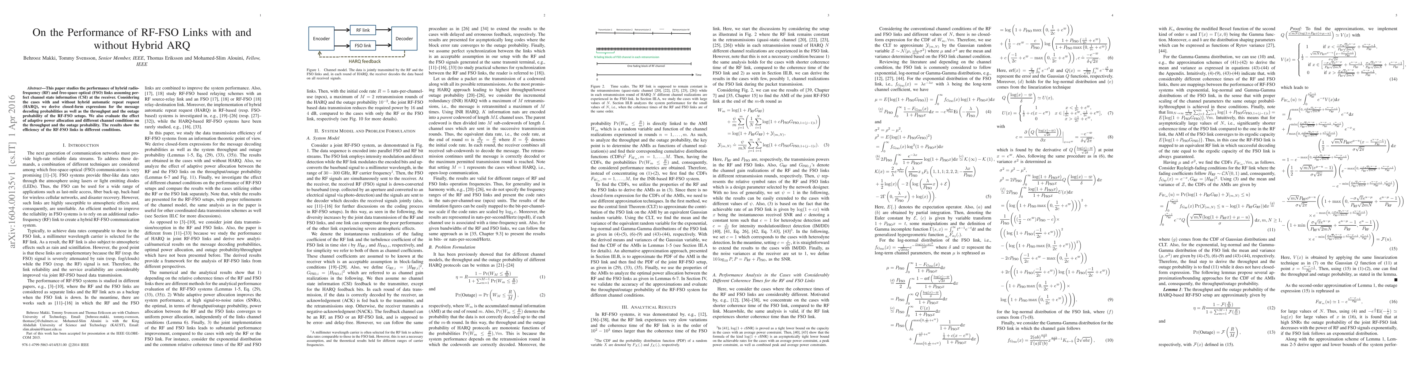 This paper evaluates the performance of hybrid RF-FSO links with and without hybrid ARQ, deriving expressions for decoding probabilities, throughput, and outage probability. It highlights the effectiveness of adaptive power allocation under varying channel conditions.