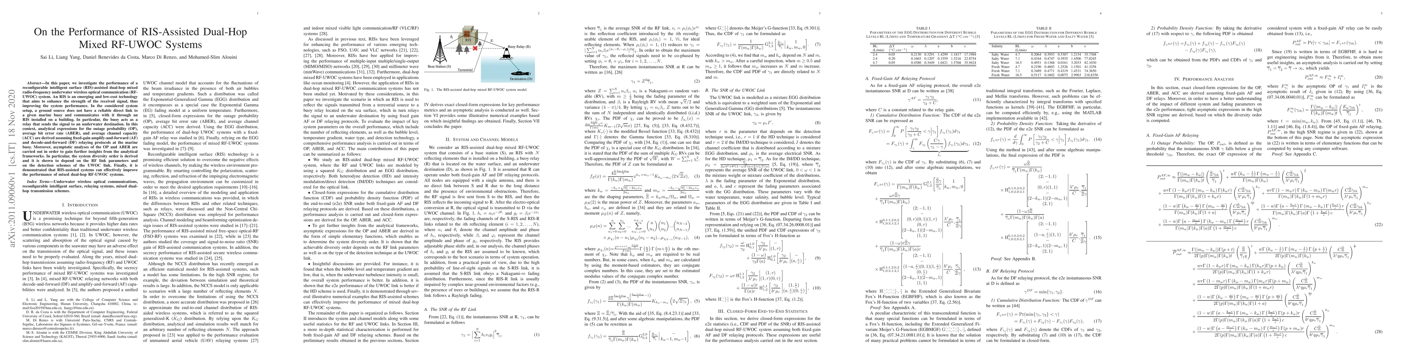 This paper evaluates the performance of a reconfigurable intelligent surface (RIS)-assisted dual-hop mixed RF-UWOC system, deriving analytical expressions for outage probability, average bit error rate, and average channel capacity. It shows that RIS technology can significantly enhance the performance of such systems by improving signal strength and system diversity order.