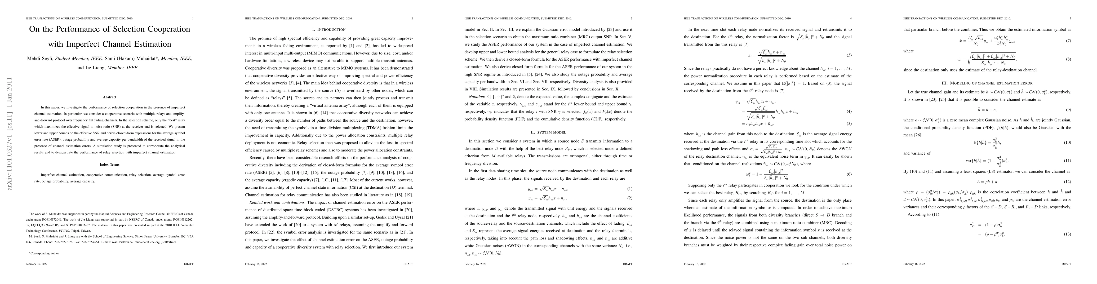 This paper examines selection cooperation in a cooperative relay network under imperfect channel estimation, deriving bounds and expressions for effective SNR, average symbol error rate, outage probability, and average capacity. Simulation results validate the analytical findings and show the impact of channel estimation errors on relay selection performance.