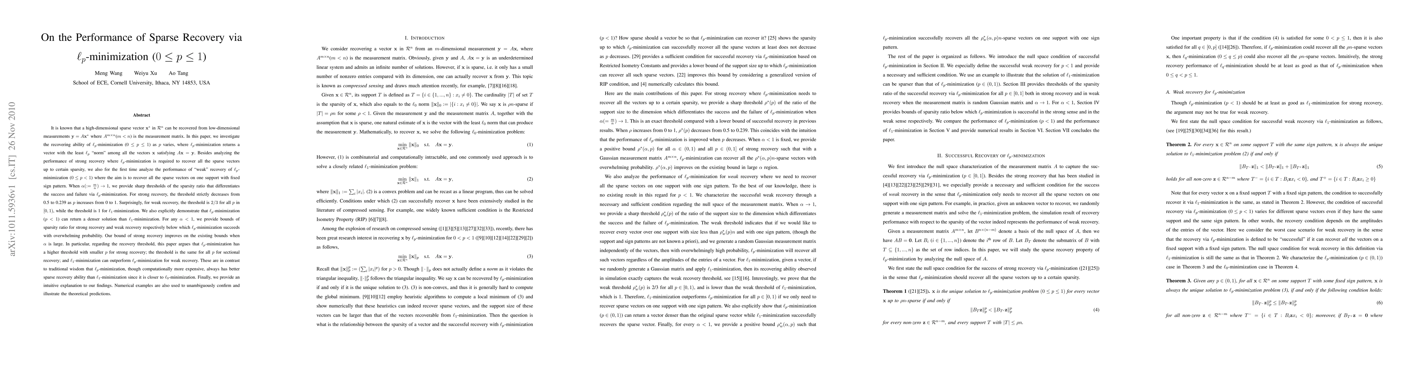 This paper investigates the performance of l_p-minimization (0<=p<=1) for sparse vector recovery, analyzing both strong and weak recovery scenarios. It finds that for strong recovery, the threshold decreases as p increases, while for weak recovery, the threshold is constant at 2/3 for p<1 and 1 for l_1-minimization, challenging the conventional belief that l_p-minimization outperforms l_1-minimization for sparse recovery.