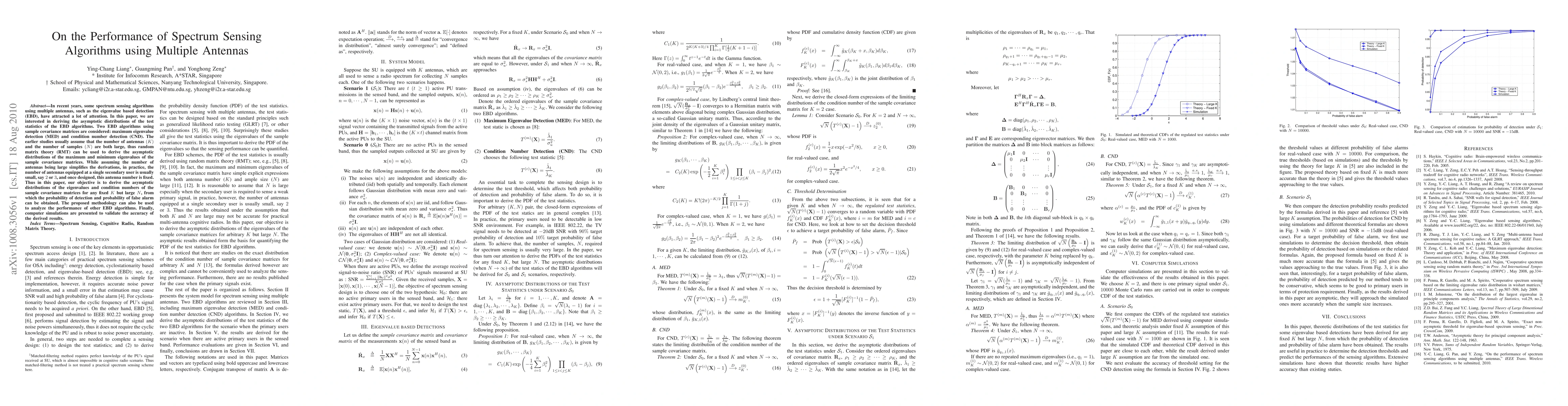 In recent years, some spectrum sensing algorithms using multiple antennas, such as the eigenvalue based detection (EBD), have attracted a lot of attention. In this paper, we are interested in deriving the asymptotic distributions of the test statistics of the EBD algorithms. Two EBD algorithms using sample covariance matrices are considered: maximum eigenvalue detection (MED) and condition number detection (CND). The earlier studies usually assume that the number of antennas (K) and the number of samples (N) are both large, thus random matrix theory (RMT) can be used to derive the asymptotic distributions of the maximum and minimum eigenvalues of the sample covariance matrices. While assuming the number of antennas being large simplifies the derivations, in practice, the number of antennas equipped at a single secondary user is usually small, say 2 or 3, and once designed, this antenna number is fixed. Thus in this paper, our objective is to derive the asymptotic distributions of the eigenvalues and condition numbers of the sample covariance matrices for any fixed K but large N, from which the probability of detection and probability of false alarm can be obtained. The proposed methodology can also be used to analyze the performance of other EBD algorithms. Finally, computer simulations are presented to validate the accuracy of the derived results.