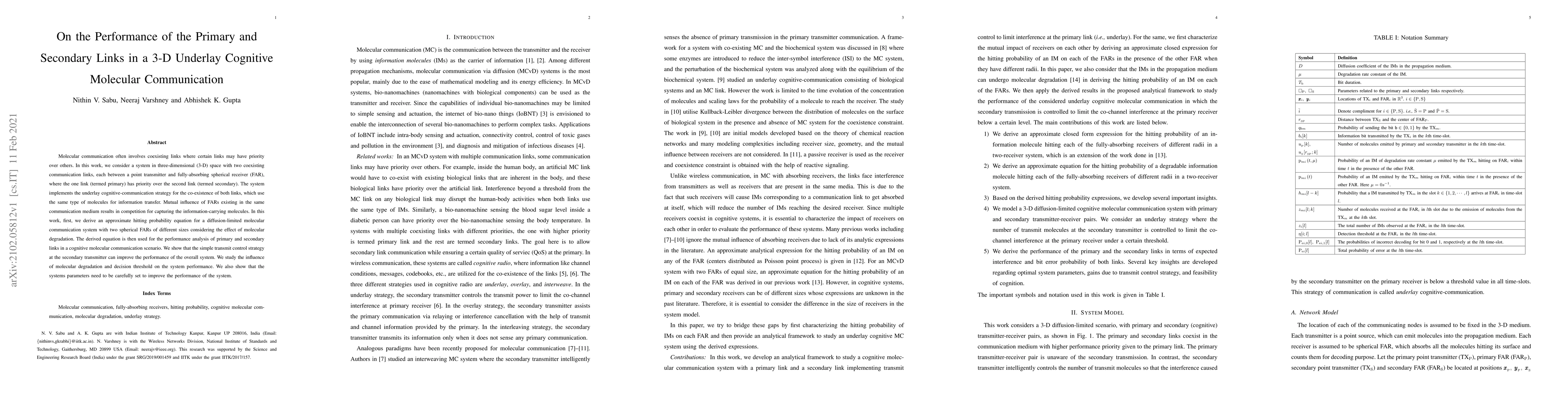 This paper investigates the performance of primary and secondary links in a 3-D cognitive molecular communication system where two coexisting links compete for information-carrying molecules. It derives an equation for hitting probability and demonstrates that transmit control strategies can enhance system performance, emphasizing the importance of parameter tuning for optimal results.