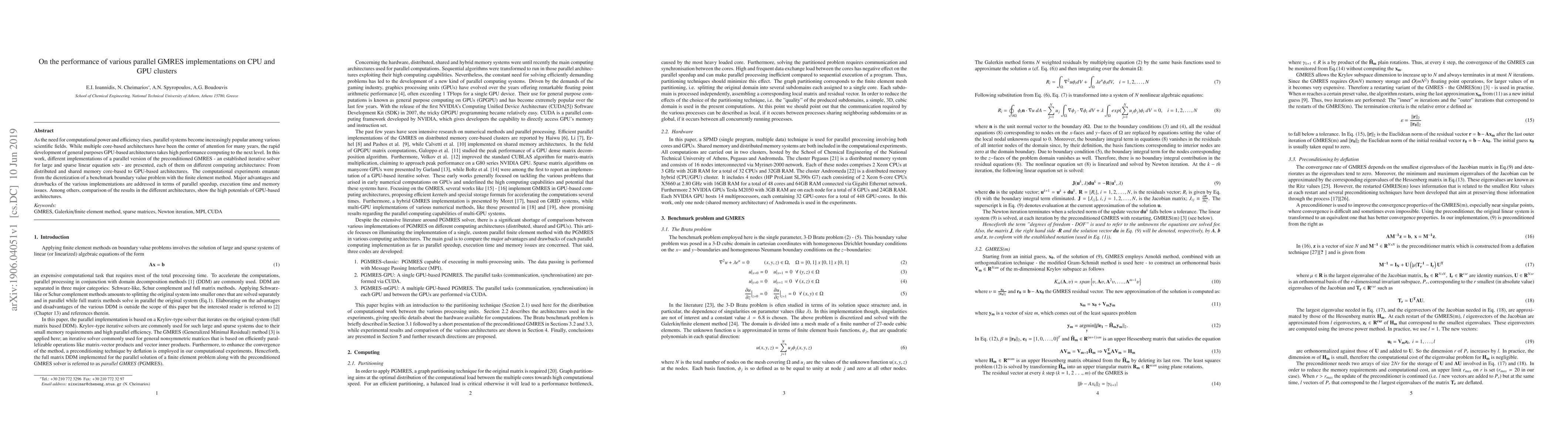 This paper evaluates various parallel implementations of the preconditioned GMRES solver on both CPU and GPU clusters, highlighting the advantages and disadvantages in terms of parallel speedup, execution time, and memory usage. The study finds that GPU-based architectures offer significant performance benefits compared to traditional CPU-based systems.