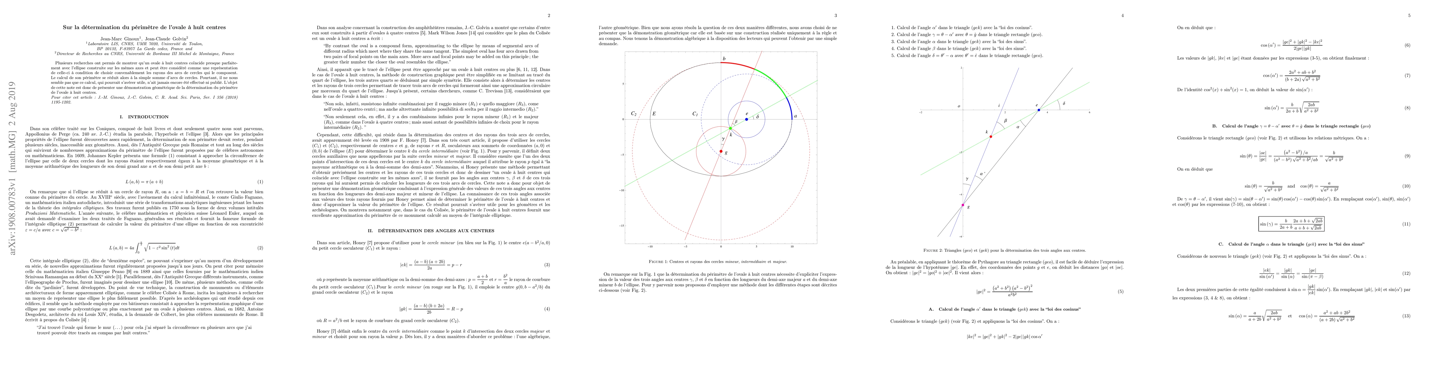 On the perimeter length determination of the eight-centered oval. Several studies have shown that an eight-centered oval coincides almost perfectly with the ellipse constructed on the same axes and can be considered as a representation of the latter provided that the radii of the arcs of circles that compose it had been suitably chosen. Its perimeter's computation is then reduced to the simple sum of arc lengths of circles. However, it doesnot seem to us that this calculation, which could prove to be useful, has never been performed nor published. This note aims thus to present a geometric demonstration of the perimeter length determination of the eight-centered oval.