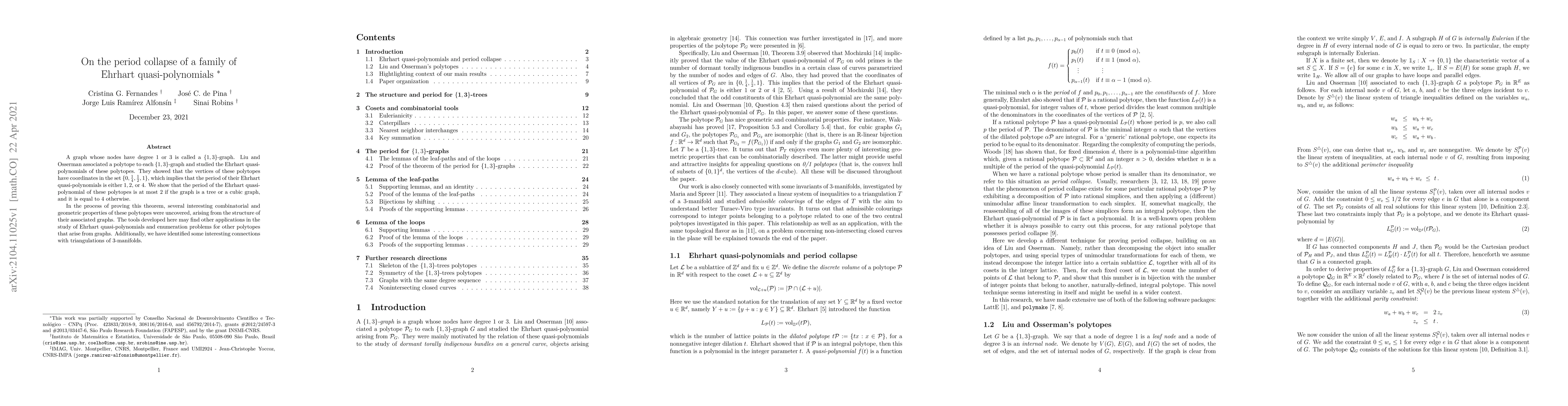 This paper investigates the period of Ehrhart quasi-polynomials associated with polytopes linked to $\{1,3\}$-graphs, revealing that the period is 2 for tree or cubic graphs and 4 otherwise. The study uncovers intriguing combinatorial and geometric properties of these polytopes and finds connections with triangulations of 3-manifolds.