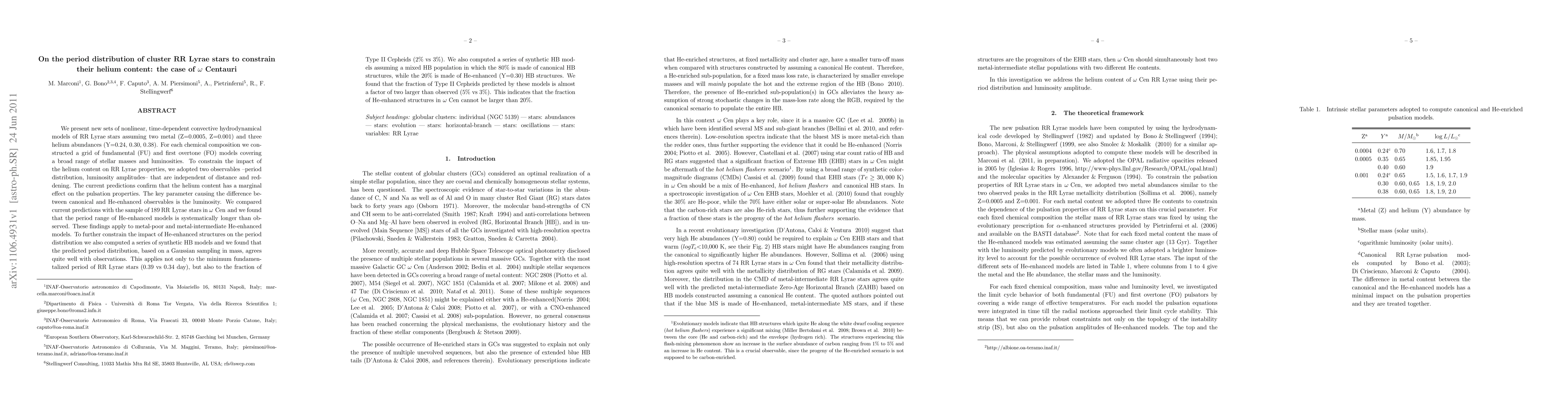 This paper investigates the period distribution of RR Lyrae stars in omega Centauri to determine the impact of helium content on their properties. The study finds that helium has a marginal effect on pulsation, with luminosity being the key factor causing differences in observables. The period range of He-enhanced models is longer than observed, suggesting that He-enhanced structures cannot exceed 20% in omega Centauri.