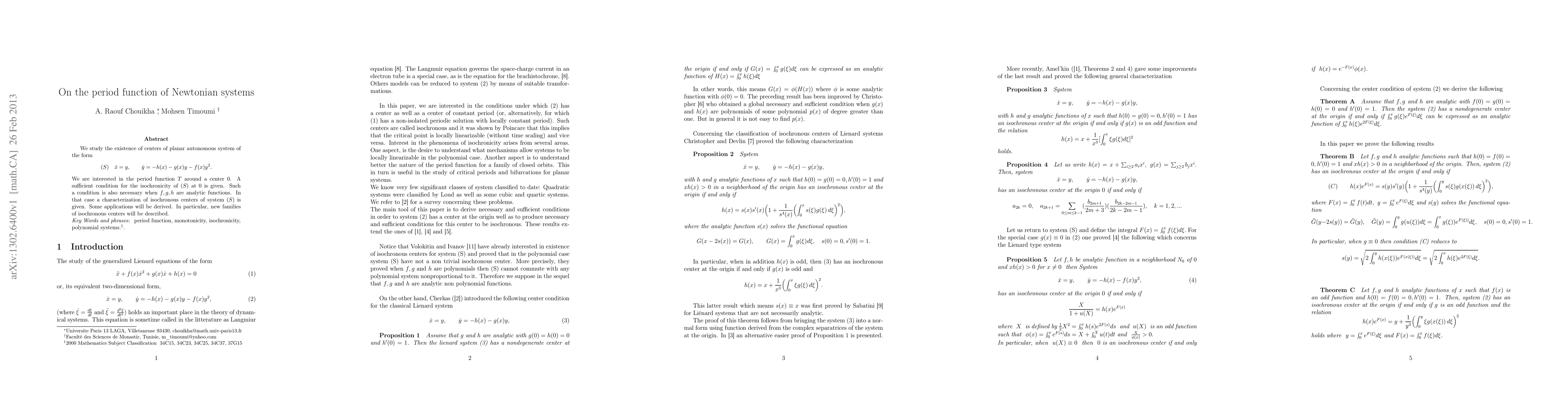 We study the existence of centers of planar autonomous system of the form $$(S) \quad \dot x=y,\qquad \dot y = -h(x) - g(x)y - f(x)y^2.$$ We are interested in the period function $T$ around a center 0. A sufficient condition for the isochronicity of (S) at 0 is given. Such a condition is also necessary when $f,g,h$ are analytic functions. In that case a characterization of isochronous centers of system (S) is given. Some applications will be derived. In particular, new families of isochronous centers will be described